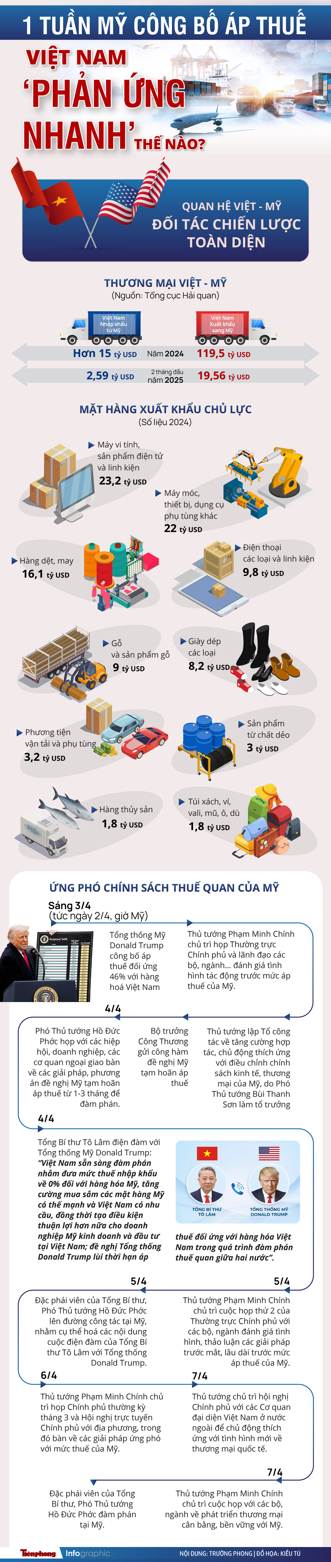 TPO - Sau khi Mỹ công bố áp thuế đối ứng 46% với hàng hóa nhập khẩu từ Việt Nam, Tổng Bí thư Tô Lâm đã có cuộc điện đàm với Tổng thống Donald Trump. Thủ tướng Phạm Minh Chính chỉ đạo lập ngay tổ "phản ứng nhanh", chủ trì nhiều cuộc họp đánh giá tác động và bàn giải pháp thích ứng. Đặc phái viên của Tổng Bí thư, Phó Thủ tướng Hồ Đức Phớc đang đàm phán tại Mỹ.