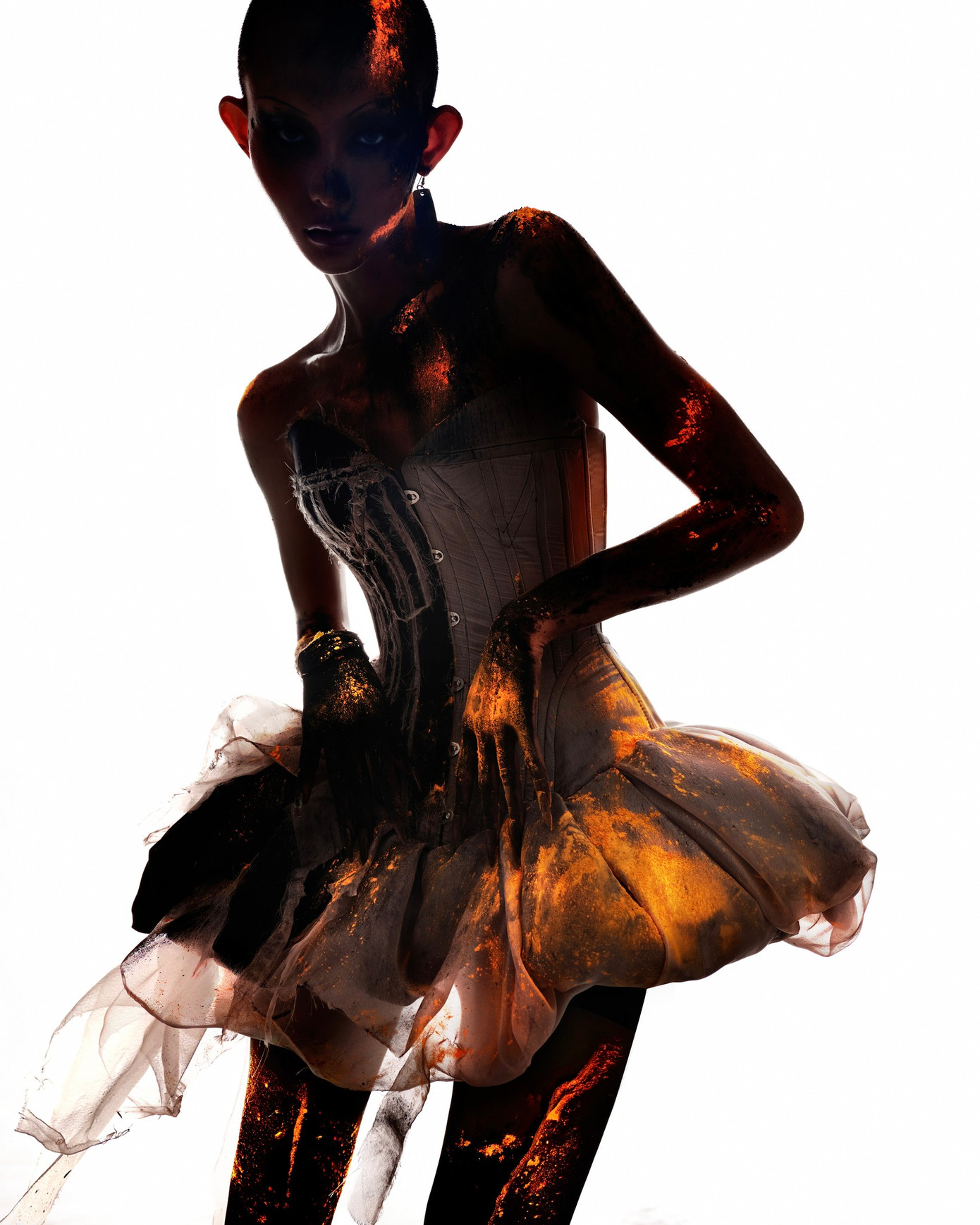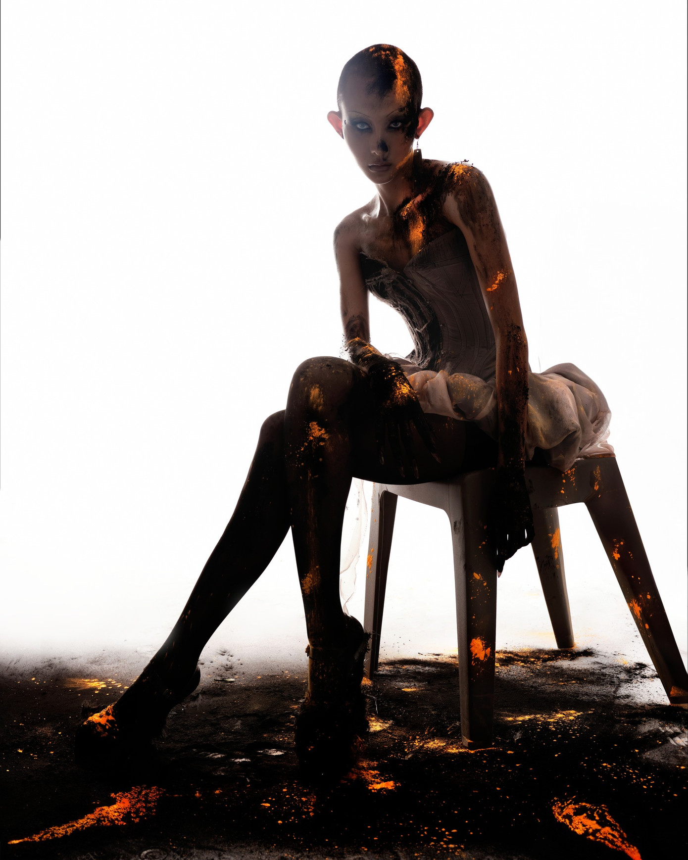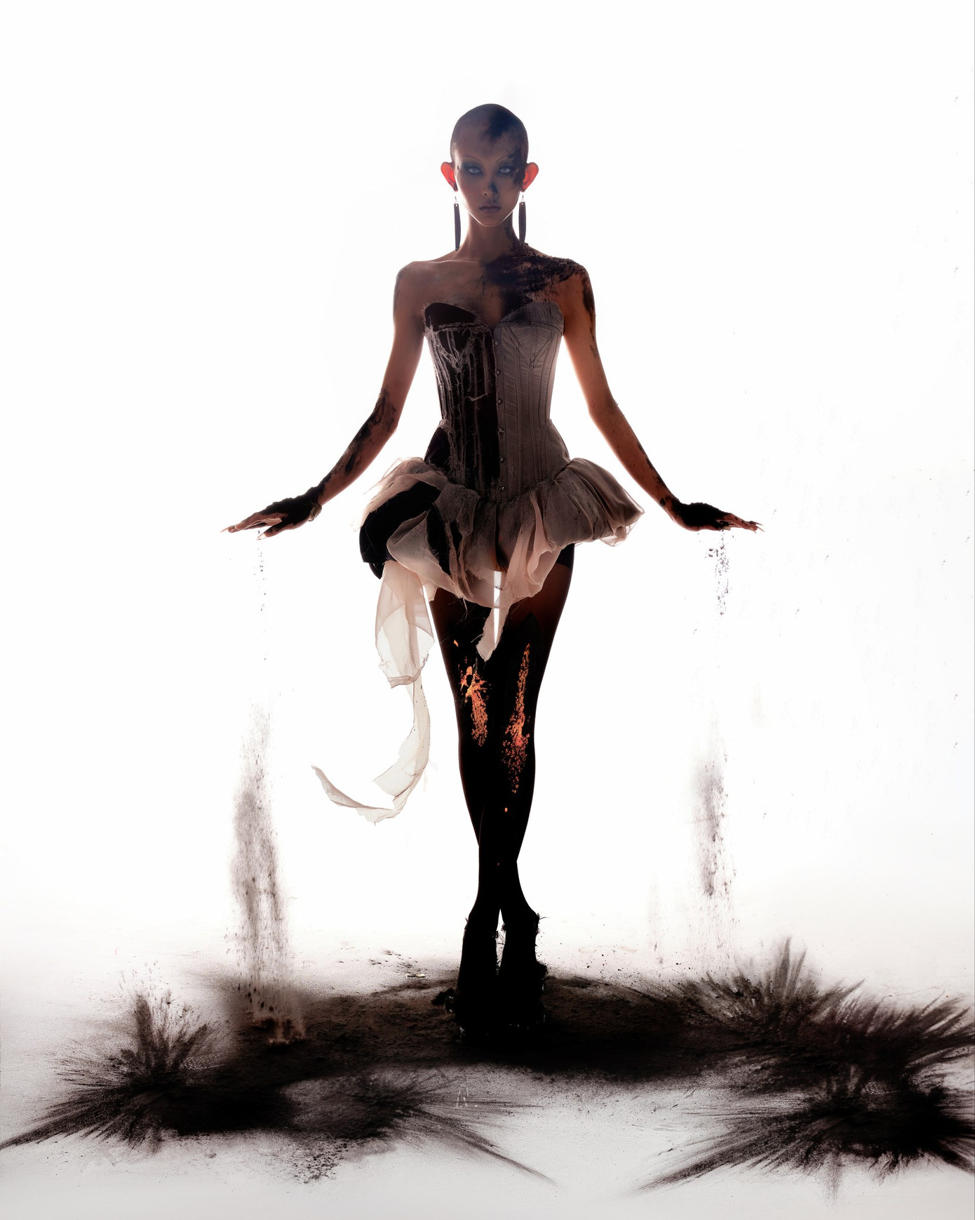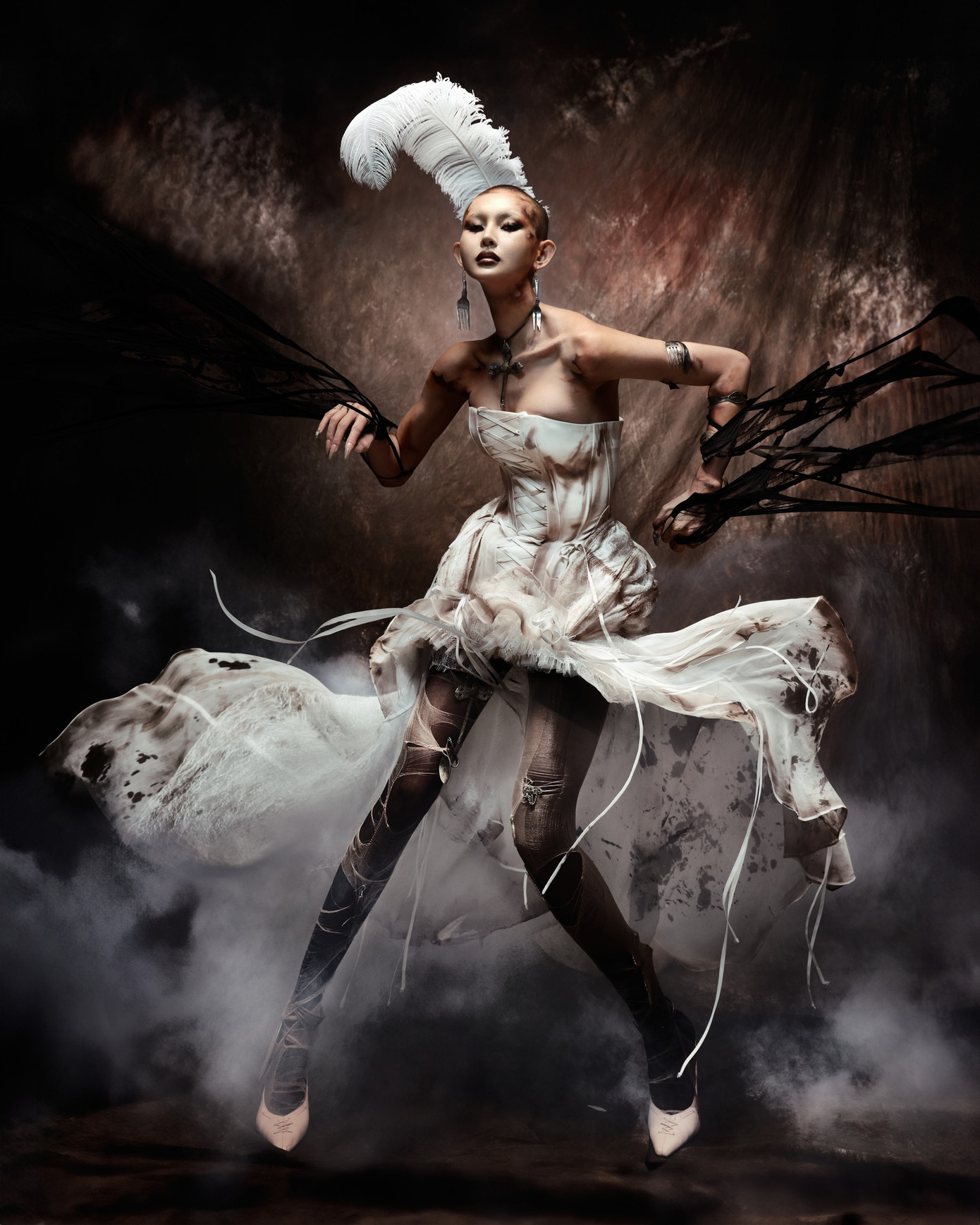 Và Lâm Minh hiện ra đầy ma mị trong những thiết kế lấy cảm hứng từ quá khứ, nhưng tâm hồn lại đang hướng đến tương lai. Cô ngồi đó giữa những mảnh tro tàn còn vương ánh lửa, với biểu cảm đầy mạnh mẽ như đã sẵn sàng làm lại từ đầu, gây dựng lại mọi thứ từ đống đổ nát đã qua.