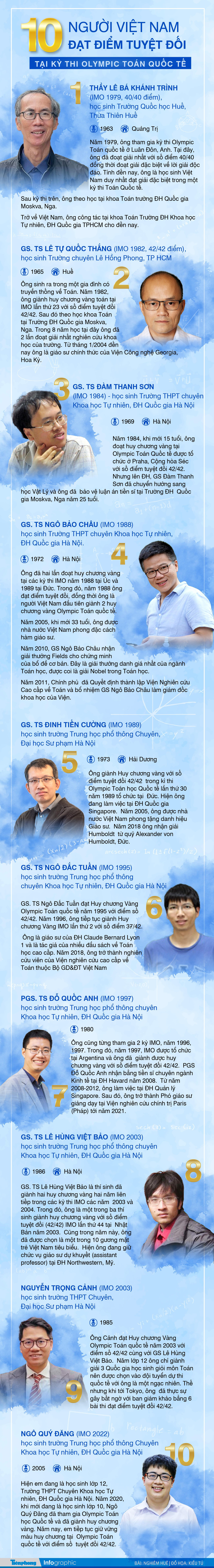 TPO - Sau gần 50 năm tham gia Olympic Toán học quốc tế (IMO), Việt Nam đã có 10 người đạt được số điểm tuyệt đối tại đấu trường quốc tế này. Đặc biệt, cả 10 gương mặt đều là nam và có tới 6/10 thành viên đến từ Trường THPT chuyên Khoa học Tự nhiên, ĐH Quốc gia Hà Nội.
