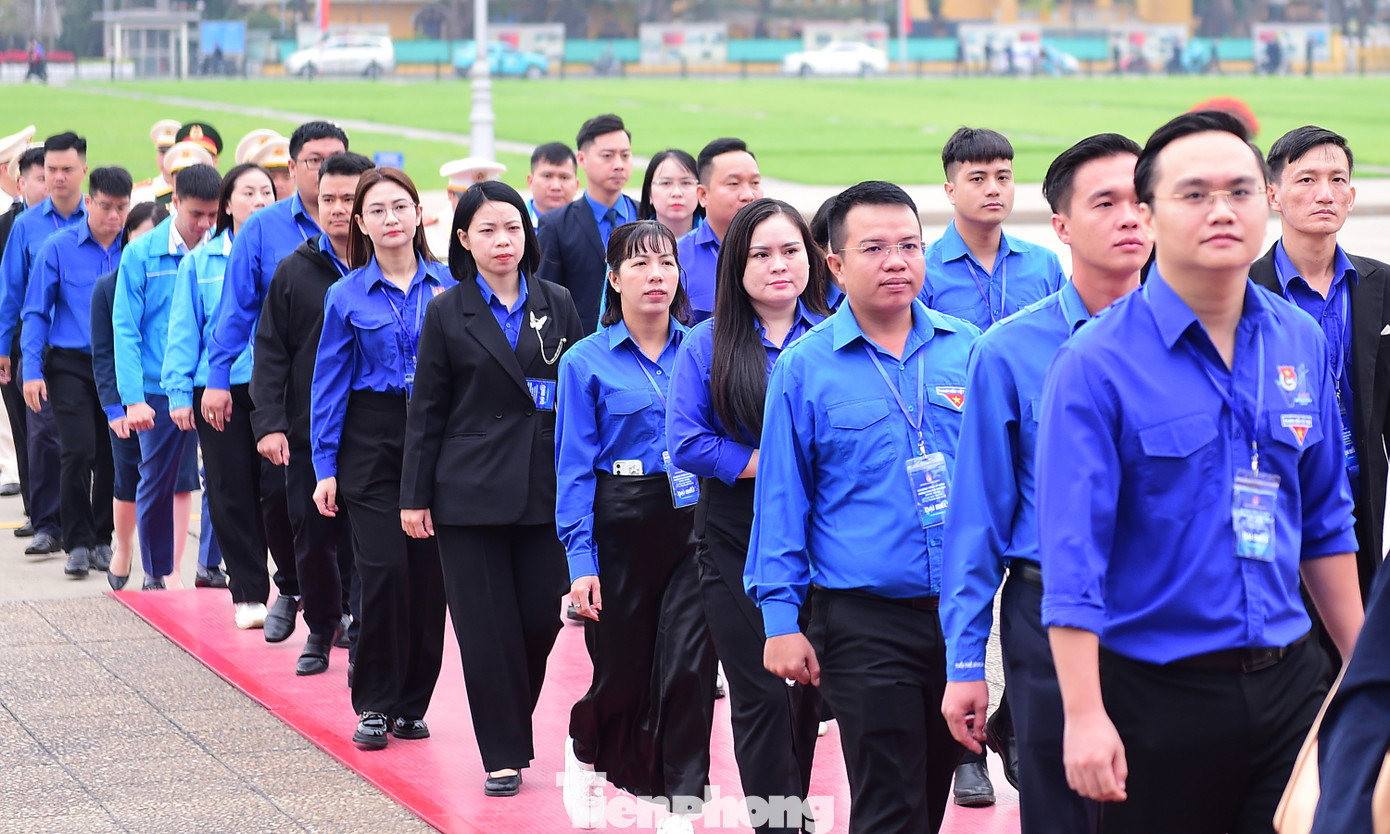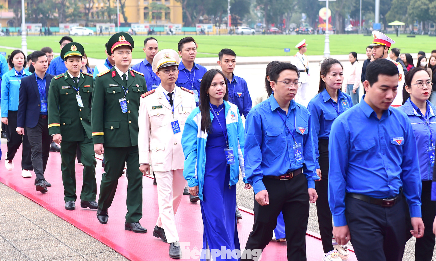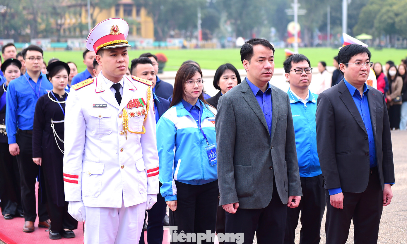 | Đoàn đại biểu Giải thưởng Lý Tự Trọng năm 2025 đặt vòng hoa và vào Lăng viếng Chủ tịch Hồ Chí Minh. Ảnh: Xuân Tùng |