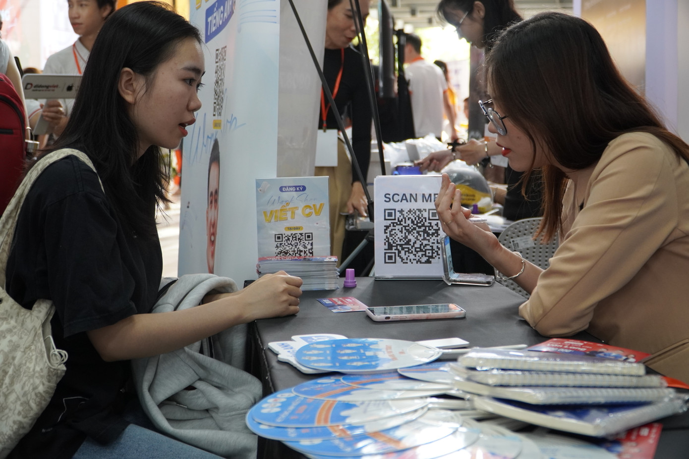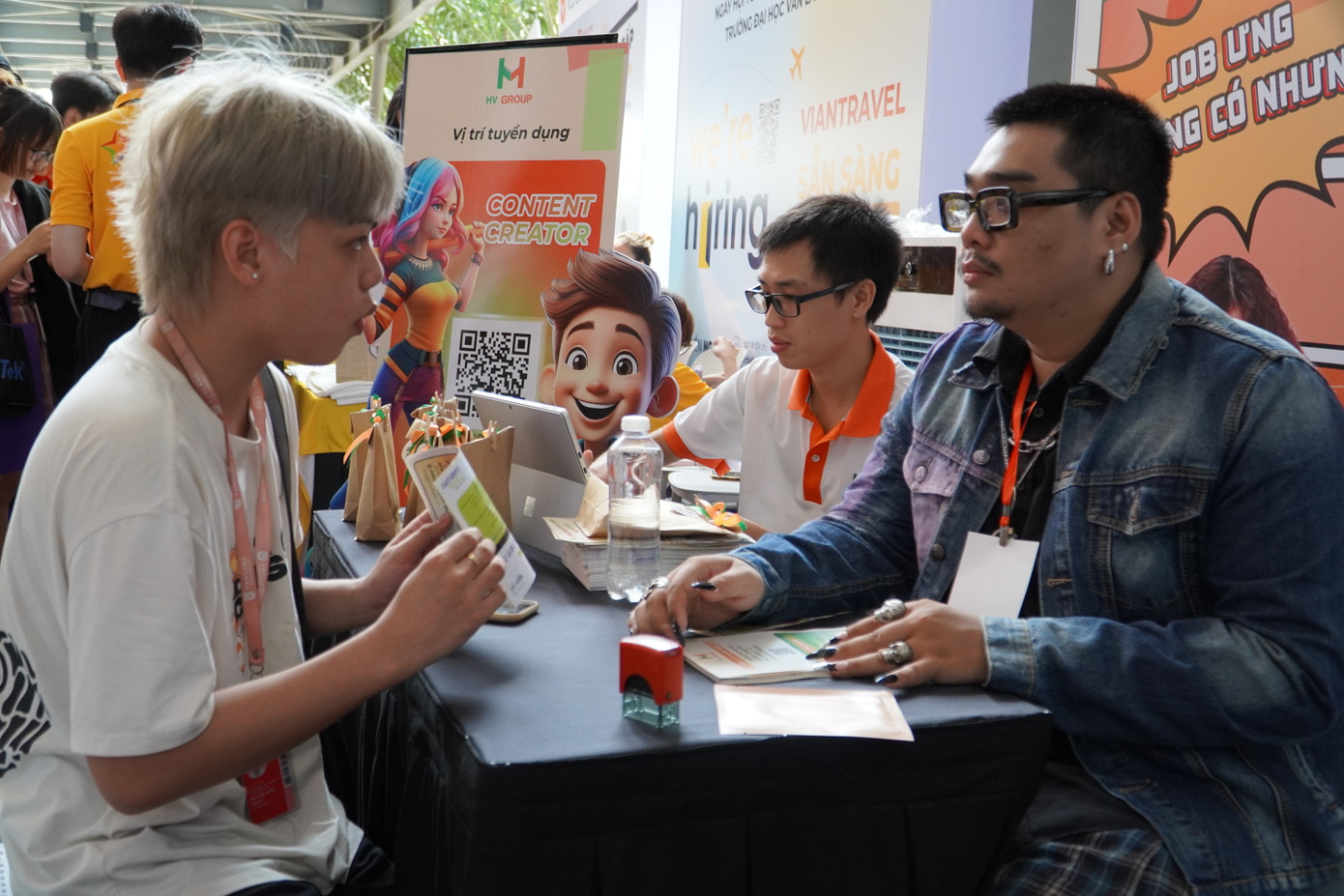 Nguyễn Mỹ Duyên (năm thứ nhất, ngành Truyền thông đa phương tiện, trường ĐH Văn Lang) đến với ngày hội việc làm để tìm kiếm cơ hội thực tập từ sớm. Trước đó Mỹ Duyên cũng đã gửi CV đến nhiều công ty nhưng phần lớn không nhận được sự phản hồi vì Mỹ Duyên chưa có nhiều kinh nghiệm trong lĩnh vực này. “Mình vẫn hy vọng sẽ tìm kiếm được công việc cộng tác cho công ty ở lĩnh vực truyền thông nội bộ. Mình mong muốn vừa đi học vừa đi làm để bản thân nhanh tiến bộ trong lĩnh vực nghề nghiệp. Ngoài ra, thông qua việc phỏng vấn với các nhà tuyển dụng mình cũng biết được thêm kinh nghiệm nhà tuyển dụng đang cần gì ở ứng viên để từ đó mình sẽ bổ sung dần dần”, Mỹ Duyên bày tỏ.