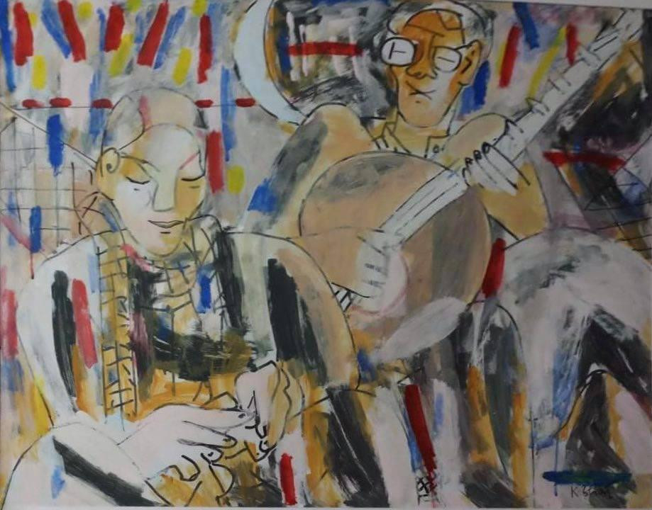 Nữ họa sỹ Kim Thái, phu nhân của Lê Công Thành, hưởng ứng chương trình thiện nguyện hướng về lực lượng tuyến đầu, bằng bức “Đờn ca tài tử”, khổ 80cm x100 cm, sơn dầu trên giấy.
