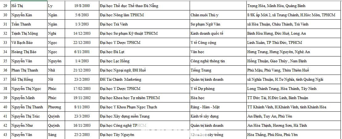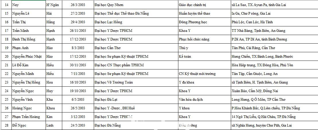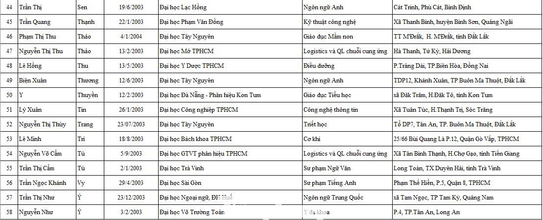 Chi tiết danh sách các sinh viên khu vực phía Nam được nhận học bổng: