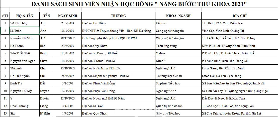 | Danh sách 70 sinh viên khu vực phía Nam nhận học bổng Nâng bước thủ khoa 2021 |