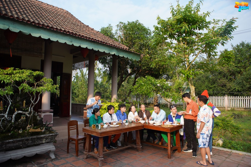 Sau bữa ăn ấm cúng, dàn cast 2 Ngày 1 Đêm đi đến vườn cừa hoa sưa chứa đầy kỉ niệm ấu thơ của Trường Giang. Anh cho biết, đây là một trong những điểm “check-in” nổi tiếng của giới trẻ khi đến thành phố Tam Kỳ - Quảng Nam.