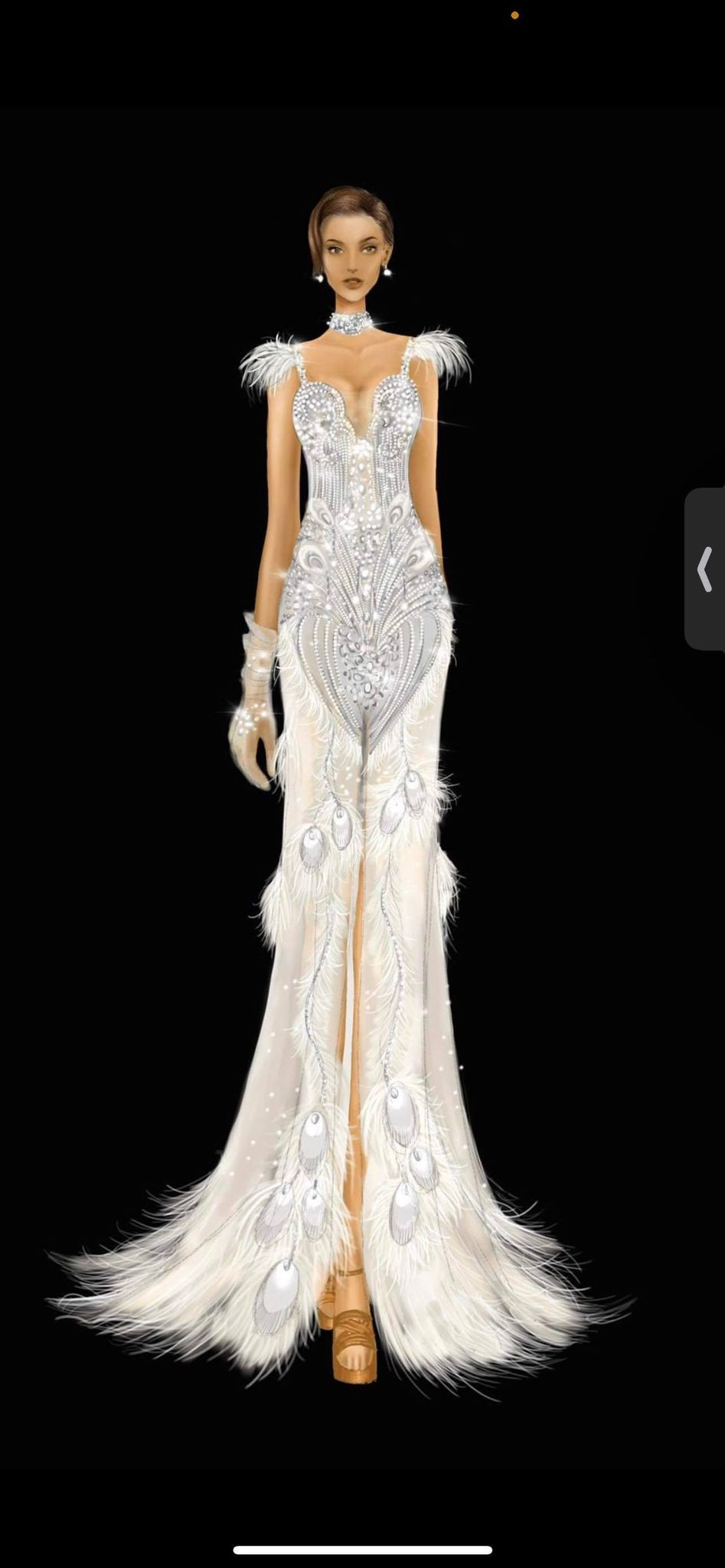 Điểm đặc biệt của chiếc váy chính là phần lông vũ được đính kết đối xứng, khéo léo ôm từ thân xuống chân. Đây là những chiếc lông được lấy từ chim đà điểu, sau đó qua nhiều lần xử lý khử mùi, chống ẩm mốc được hai nhà thiết kế tách nhỏ từng sợi lông thành các mảnh riêng lẻ và kết lại một lần nữa theo dáng uốn lượn của từng sợi lông chim khổng tước. Cách này cũng để những chiếc lông có màu sắc chân thật hơn cũng như tăng sự bồng bềnh khi di chuyển.