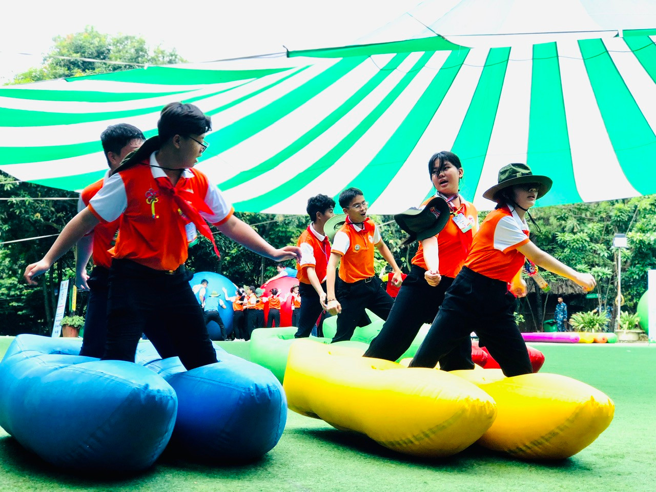 Đồng thời, các đại biểu thiếu nhi và anh, chị Tổng phụ trách còn tham gia nhiều trò chơi thử thách như: xếp hình, làm bánh trôi nước, đi hài khổng lồ, đua ngựa, gậy hơi, bóng hơi, dựng lều tốc độ, mắc võng 2 tầng, làm tranh lá, lọc nước, nhóm bếp lửa...