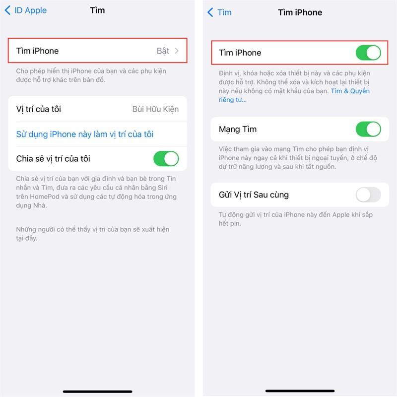 Bước 4: Bạn chọn vào mục Tìm iPhone và kích hoạt tính năng này bằng cách gạt nút sang phải.