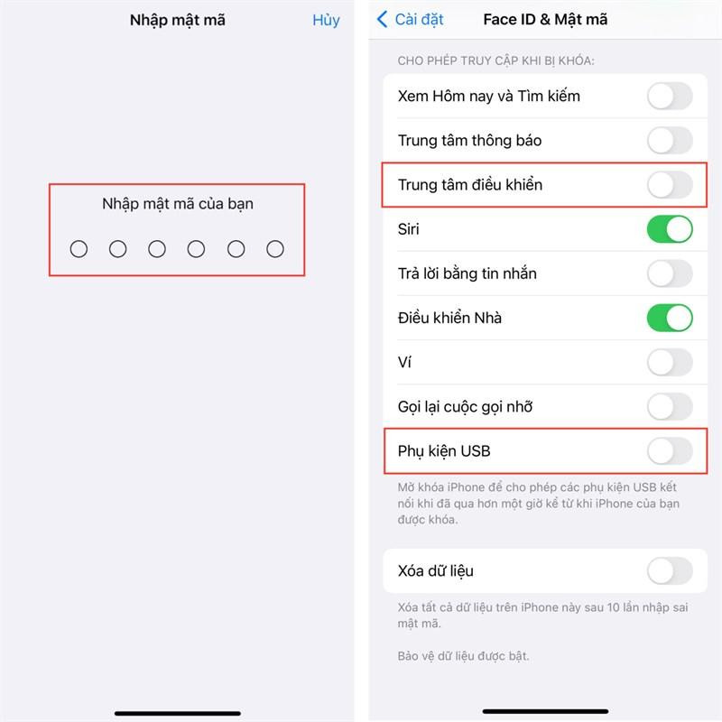 Bước 2: Bạn nhập mật mã iPhone của bạn, sau đó bạn tắt đi các mục Trung tâm điều khiển và Phụ kiện USB bằng cách gạt nút sang trái nhé!