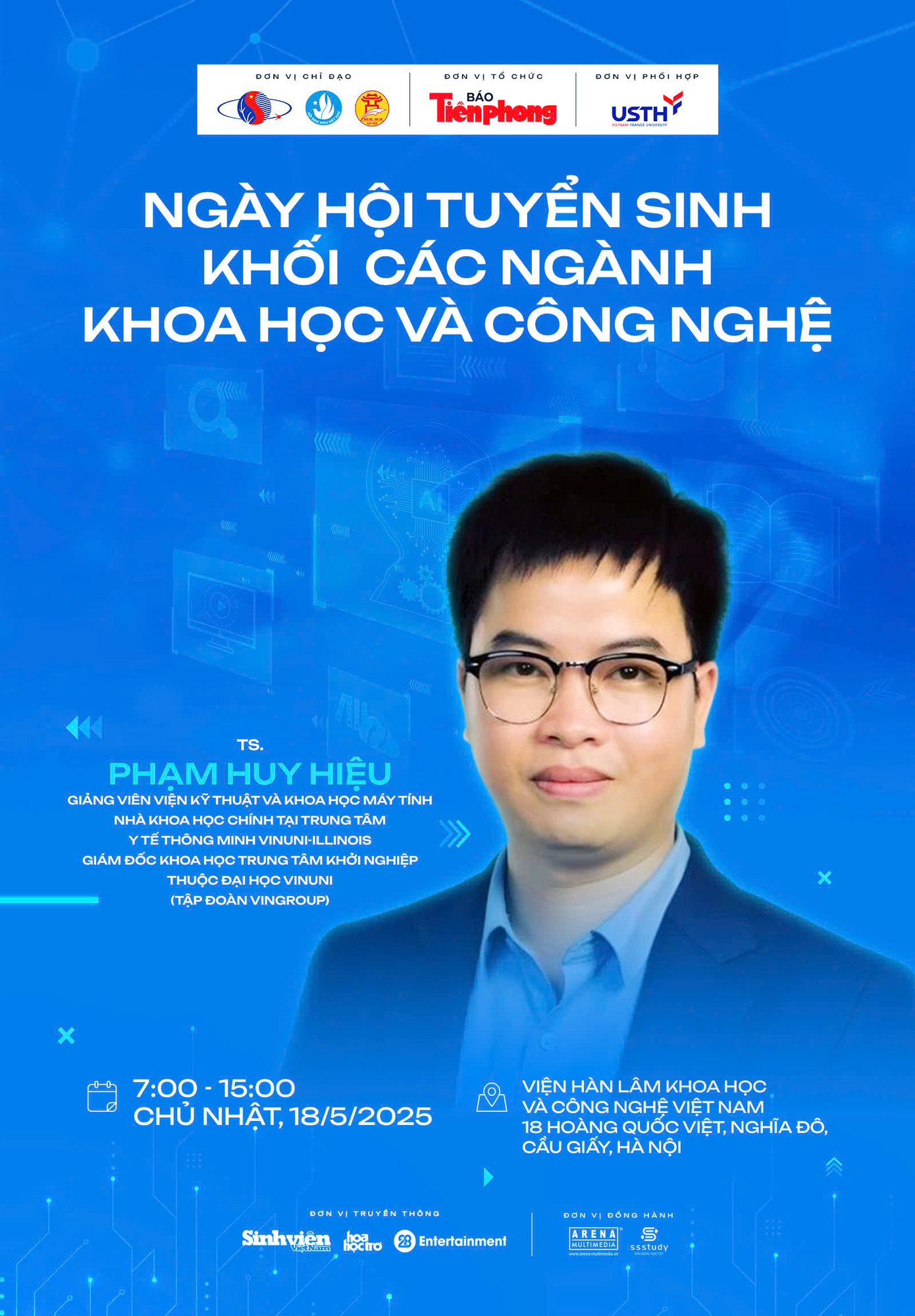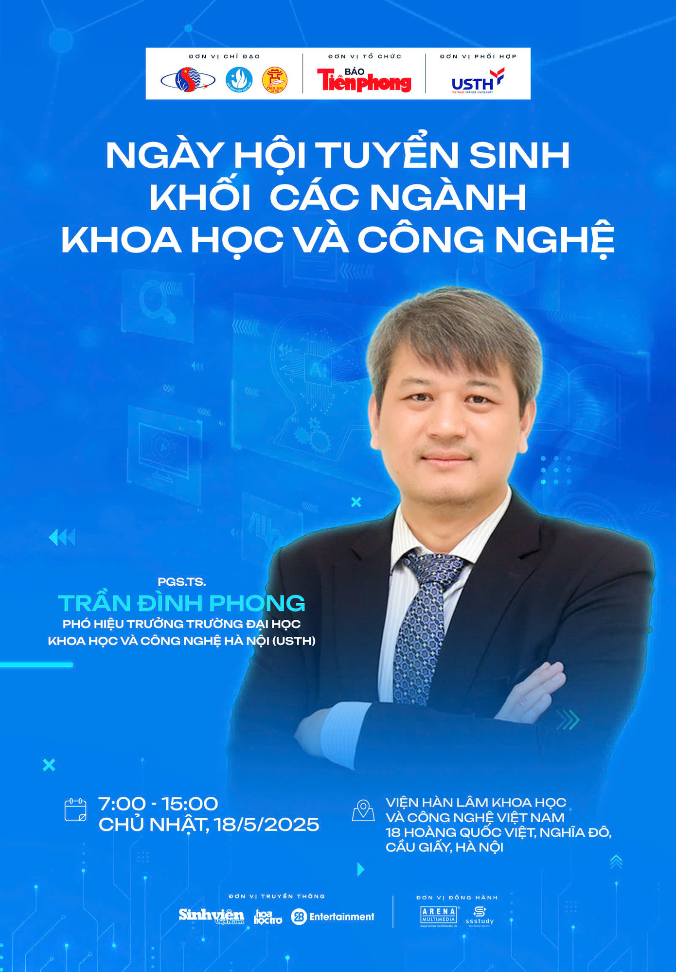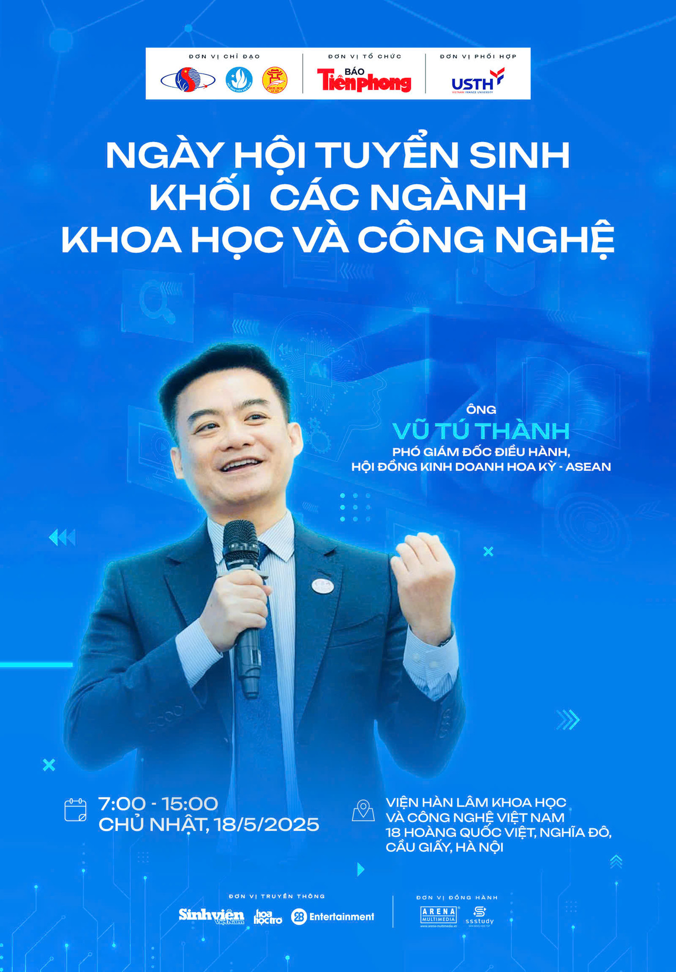 Ngày hội tuyển sinh khối các ngành Khoa học và Công nghệ diễn ra vào 7h - 15h Chủ nhật ngày 18/5/2025 tới đây tại Viện Hàn lâm Khoa học và Công nghệ (18 Hoàng Quốc Việt, Phường Nghĩa Đô, Quận Cầu Giấy, Hà Nội), do báo Tiền Phong tổ chức, dưới sự chỉ đạo và phối hợp của Viện Hàn lâm Khoa học và Công nghệ Việt Nam, T.Ư Hội Sinh viên Việt Nam, Sở GD&ĐT Hà Nội, Trường Đại học Khoa học và Công nghệ Hà Nội (USTH)...