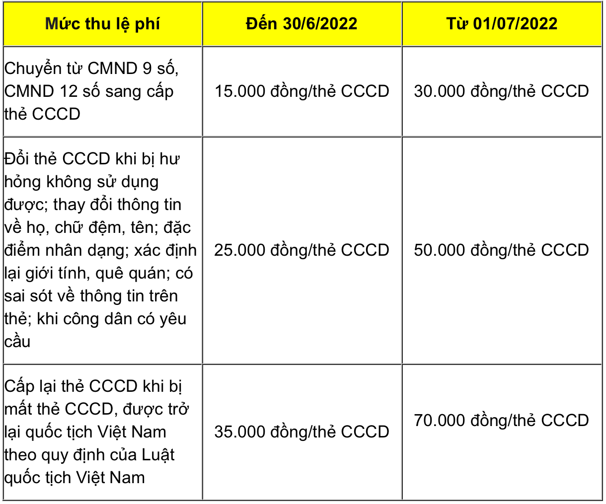 Dưới đây là mức lệ phí cấp CCCD trong năm 2022:
