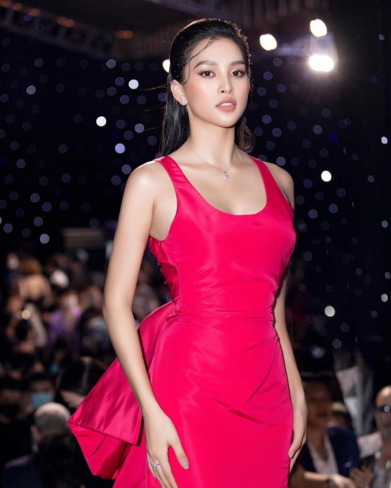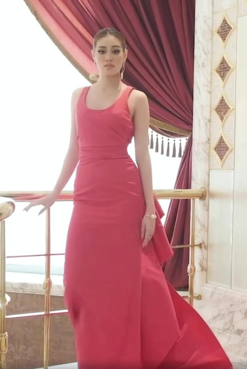 Hoa hậu Khánh Vân mặc 4 mẫu thiết kế ở video này, trong đó có một thiết kế màu hồng đỏ ôm sát, từng được Hoa hậu Tiểu Vy và Hoa hậu Đỗ Thị Hà diện trước đó.