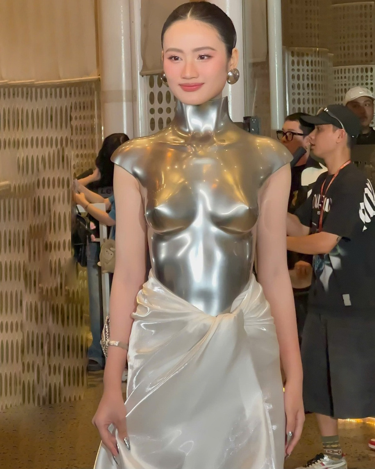 Cô mặc một thiết kế từ lụa hồng có kiểu dáng bị cho là khá giống váy ngủ, từ hai dây mỏng manh đến phần lưng cắt khoét rộng. Nhưng điều khiến netizen dậy sóng chính là Thủy Tiên bỏ qua nội y, khiến mọi người ái ngại khi thấy cô.