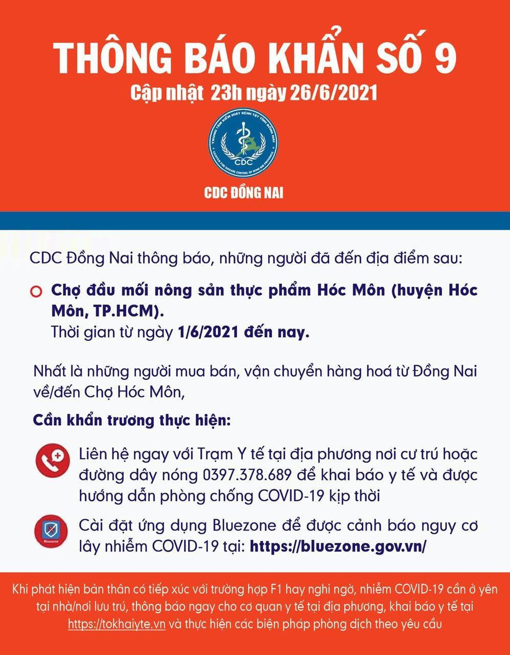 Sáng 27/6, Trung tâm kiểm soát bệnh tật (CDC) Đồng Nai ra thông báo khẩn yêu cầu những người đã từng đến địa điểm chợ đầu mối nông sản, thực phẩm Hóc Môn (huyện Hóc Môn, TP HCM) trong thời gian từ ngày 1/6 đến nay, cần phải liên hệ với Trạm y tế địa phương nơi cư trú để khai báo y tế và được hướng dẫn phòng, chống COVUD-19 kịp thời. Trong đó, CDC Đồng Nai đặc biệt lưu ý đối với những người mua bán, vận chuyển hàng hóa từ Đồng Nai về/đến chợ đầu mối Hóc Môn.
