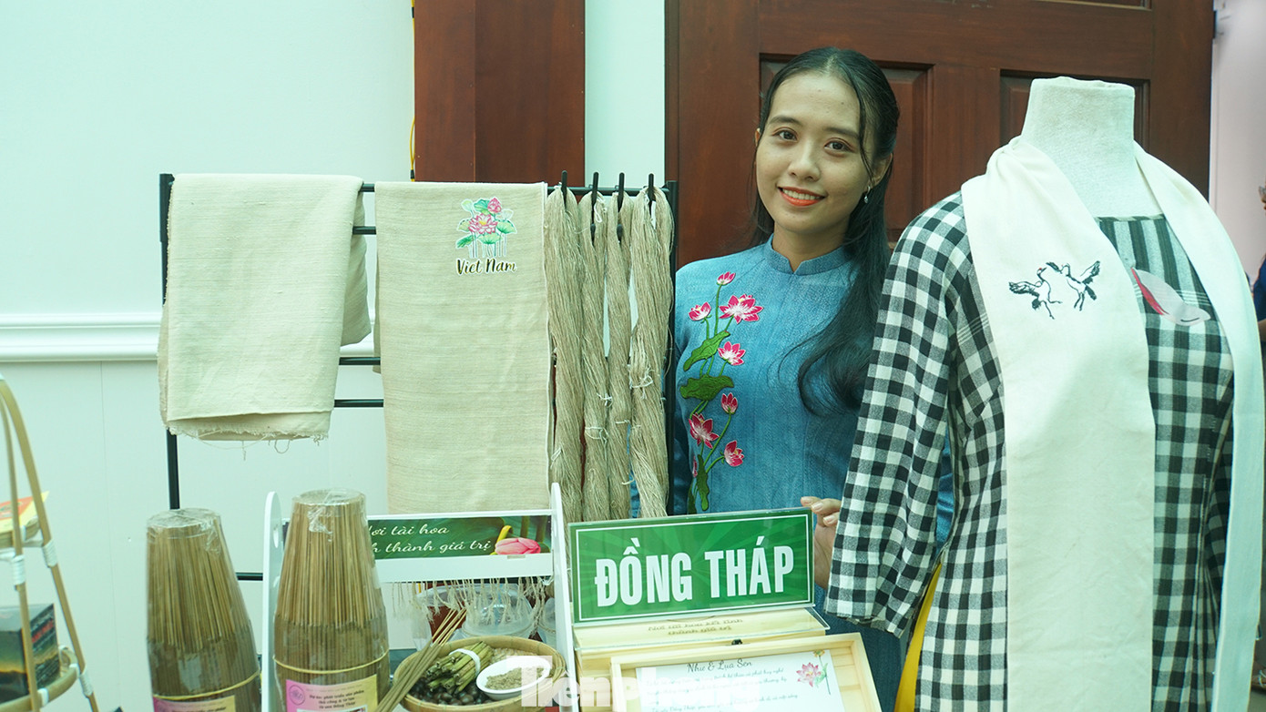 | Thí sinh tỉnh Đồng Tháp trình bày dự án Phát triển sản phẩm thủ công và tơ lụa từ sen. Ảnh: Hòa Hội |