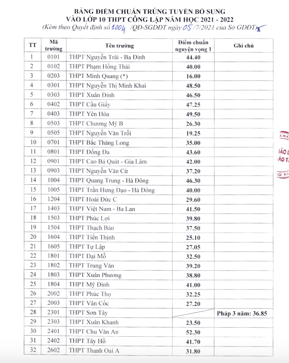 | Điểm chuẩn trúng tuyển bổ sung vào lớp 10 THPT của 40 trường công lập tại Hà Nội. |