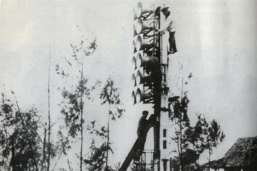 | Chiếc loa có đường kính vành loa 1,7 mét, công suất 500W xuất hiện ở bờ Bắc sông Bến Hải. |