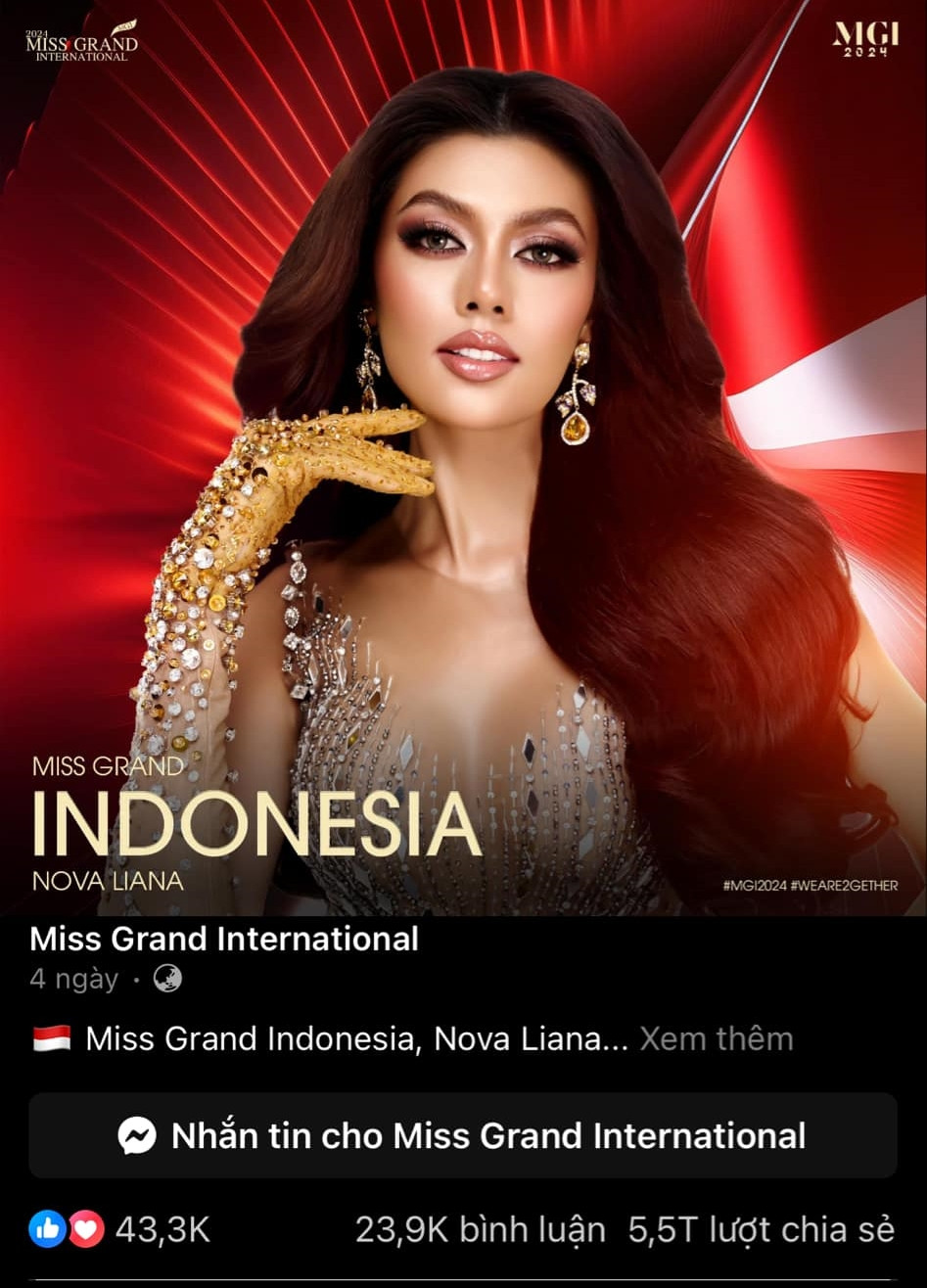 Nhưng bất ngờ hơn nữa, đại diện Indonesia vốn không được khán giả nước này ủng hộ khi lên ngôi Hoa hậu. Bởi tại cuộc đua Miss Grand Indonesia 2024, Á hậu 1 mới là cô gái được người dân nước này yêu thích nhất, nhưng vương miện lại thuộc về Nova Liana. Từ một cô Hoa hậu không được người dân Indonesia, Nova Liana đã tạo nên điều khó tin khi trở thành thí sinh có ảnh được chia sẻnhiều nhất Miss Grand International 2024 tính đến thời điểm này.