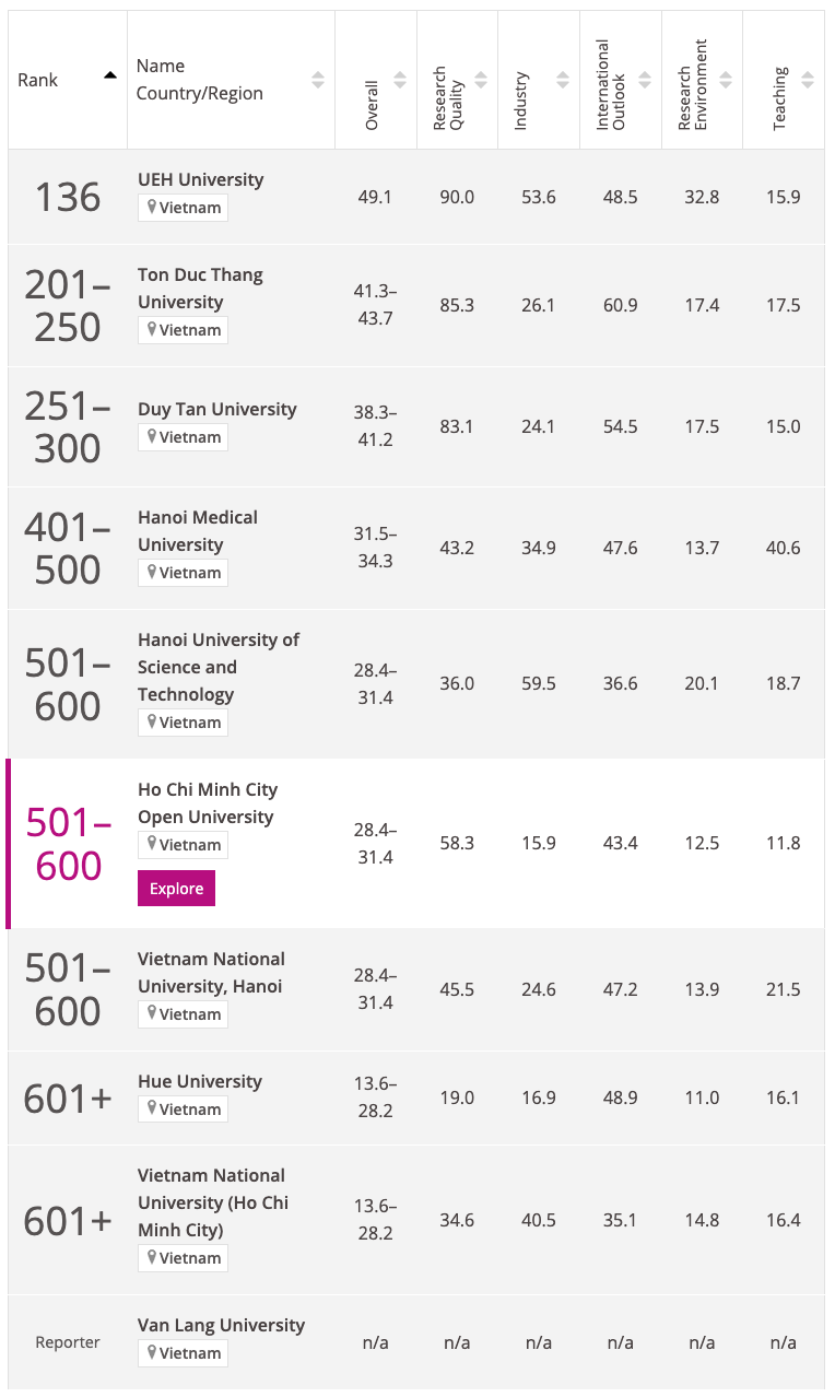Xếp ở vị trí 136, Đại học Kinh tế TP.HCM dẫn đầu trong số 9 trường đại học của Việt Nam năm nay. Đây cũng là lần đầu tiên nước ta có trường đại học được xếp ở thứ hạng cao theo đánh giá của THE.