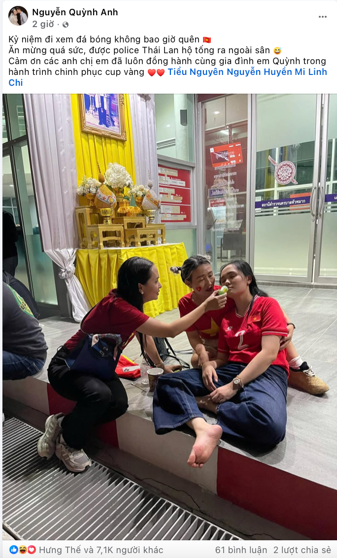 Mới đây, "công chúa béo" Quỳnh Anh cũng chia sẻ khoảnh khắc "dở khóc dở cười" khi ăn mừng chức vô địch của ĐT Việt Nam tại sân vận động Rajamangala (Băng Cốc, Thái Lan). Cụ thể, Quỳnh Anh viết: "Kỷ niệm đi xem đá bóng không bao giờ quên. Ăn mừng quá sức, được police (cảnh sát - PV) Thái Lan hộ tống ra ngoài sân". Cô nàng cũng không quên cảm ơn người hâm mộ đã ủng hộ cho chồng và đội tuyển: "Cảm ơn các anh chị em đã luôn đồng hành cùng gia đình em Quỳnh trong hành trình chinh phục cúp vàng".