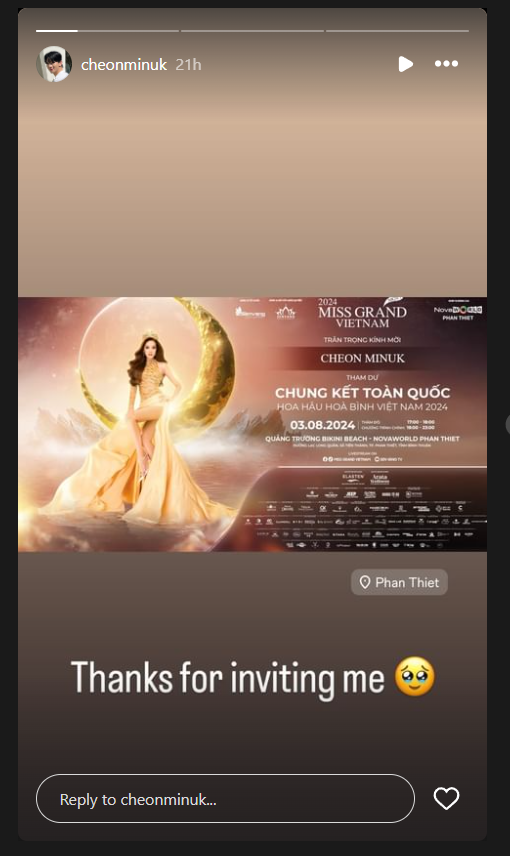 Trong đêm Chung kết cuộc thi Hoa hậu Hòa bình Việt Nam 2024 diễn ra vào tối 3/8, Á hậu 1 Bùi Khánh Linh có màn final walk kết thúc nhiệm kỳ. Cheon Minuk cũng nhận được giấy mời và có mặt tại Việt Nam tham gia cổ vũ nàng hậu.