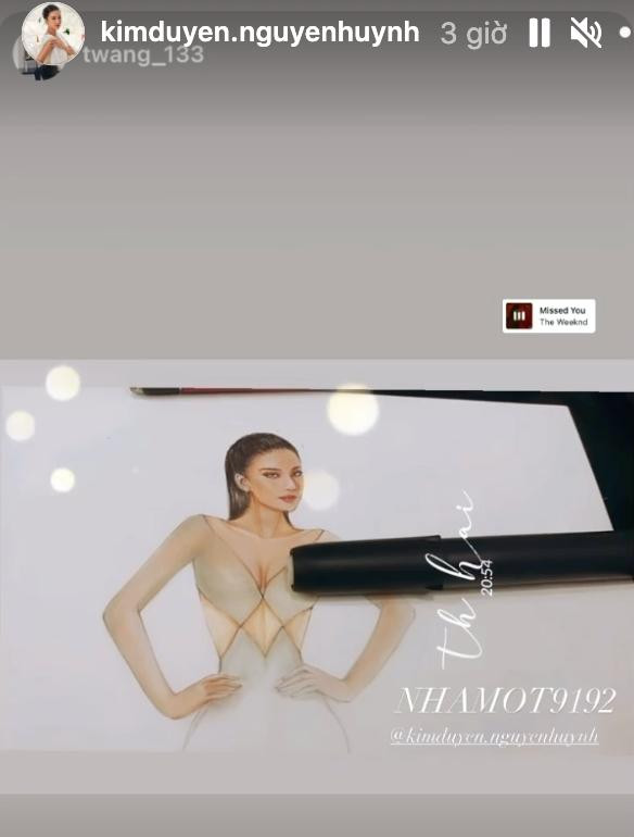 Mới đây trên tài khoản Instagram của mình, Á hậu Kim Duyên đã chia sẻ hình ảnh một phần thiết kế được dự đoán sẽ theo nàng hậu tới đấu trường nhan sắc lớn nhất nhì hành tinh. Thiết kế chỉ hé lộ nửa phần thân trên, có vẻ như sẽ là một chiếc váy kiểu xuyên thấu, khoe triệt để đường cong của người mặc.