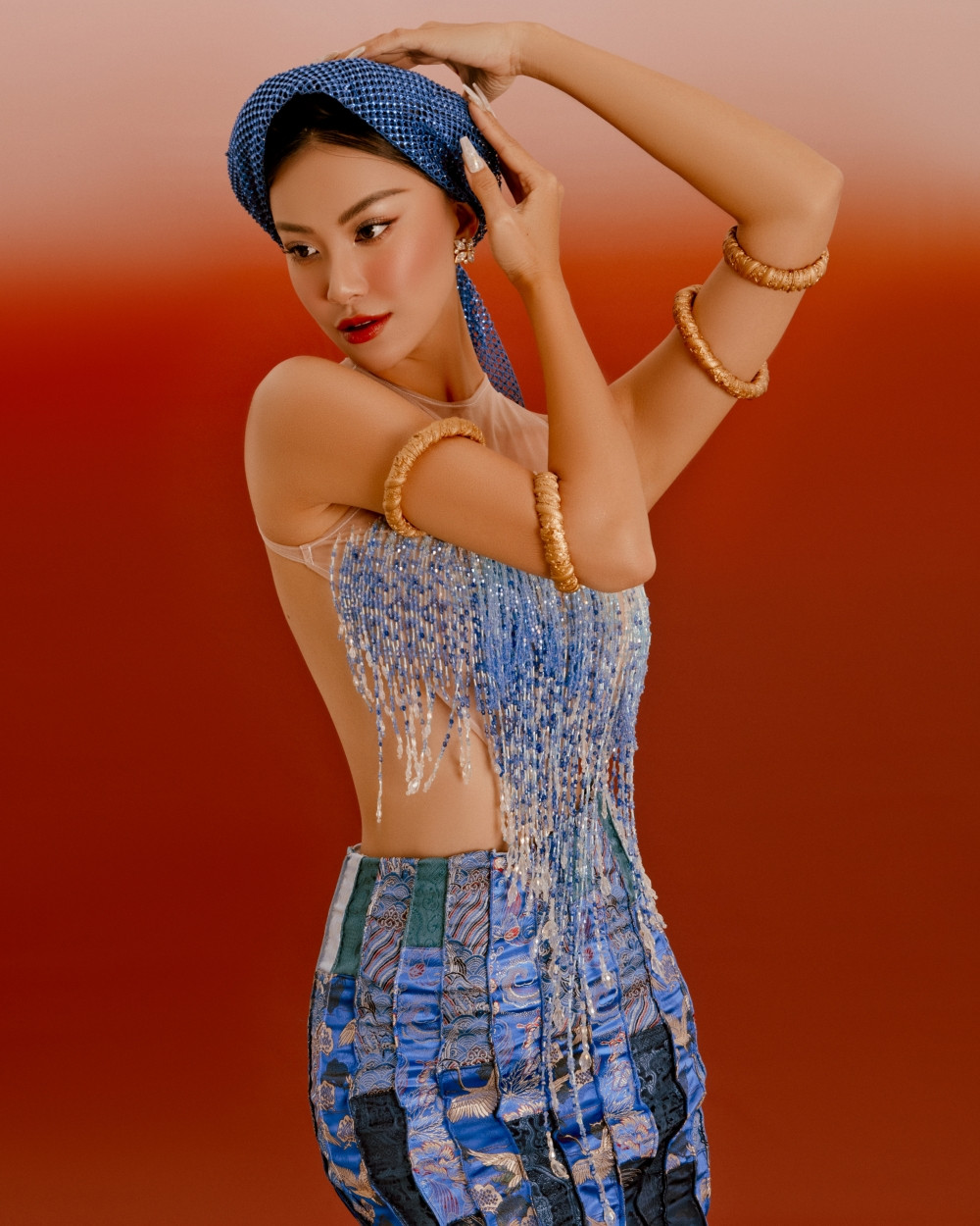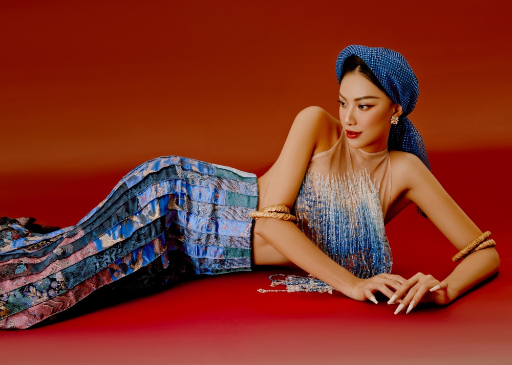Nàng hậu chọn trang phục áo yếm sắc xanh cách tân cho bộ ảnh lần này. Phần áo yếm tua rua được đính kết đá khéo léo, gợi vẻ quyến rũ nhưng không kém phần duyên dáng. Phần chân váy được thiết kế phá cách với phom dáng xếp đặc biệt và những họa tiết truyền thống như chim hạc, hoa văn sóng biển…