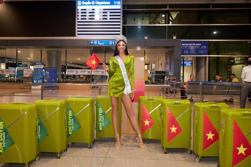 Hành lý mang theo cho cuộc thi được Á hậu Kim Duyên và ê-kíp chuẩn bị trong 8 chiếc vali và 1 thùng đựng trang phục dân tộc. Hành lý chủ yếu là trang phục, phụ kiện, quà tặng cho các đại diện các nước tham gia Miss Universe 2021. Đặc biệt, Á hậu Kim Duyên cũng mang theo không ít đồ ăn, trong đó có món phở ăn liền của Việt Nam. Cô nàng dự định sẽ mời một số thí sinh món ăn truyền thống này của người Việt.