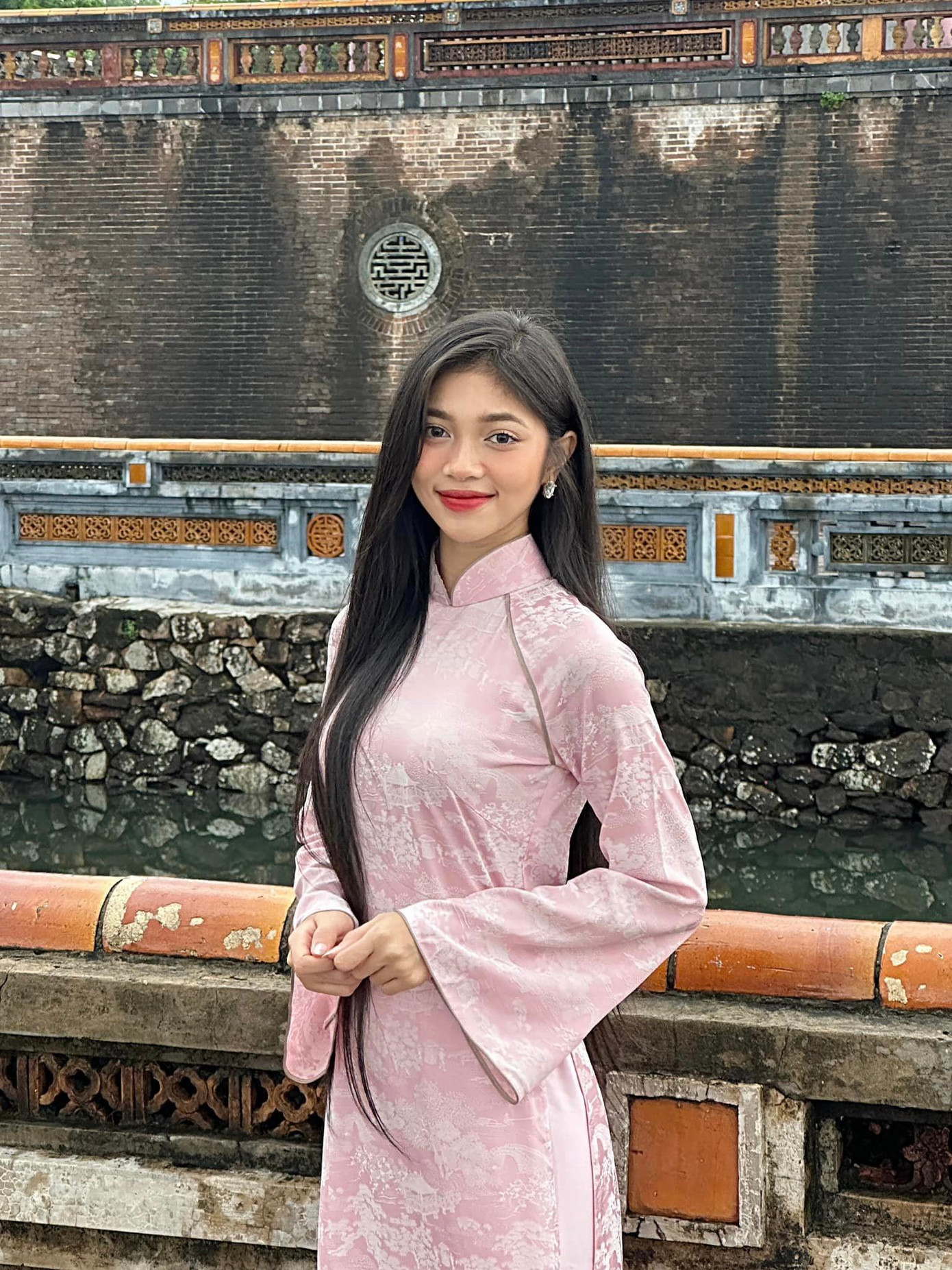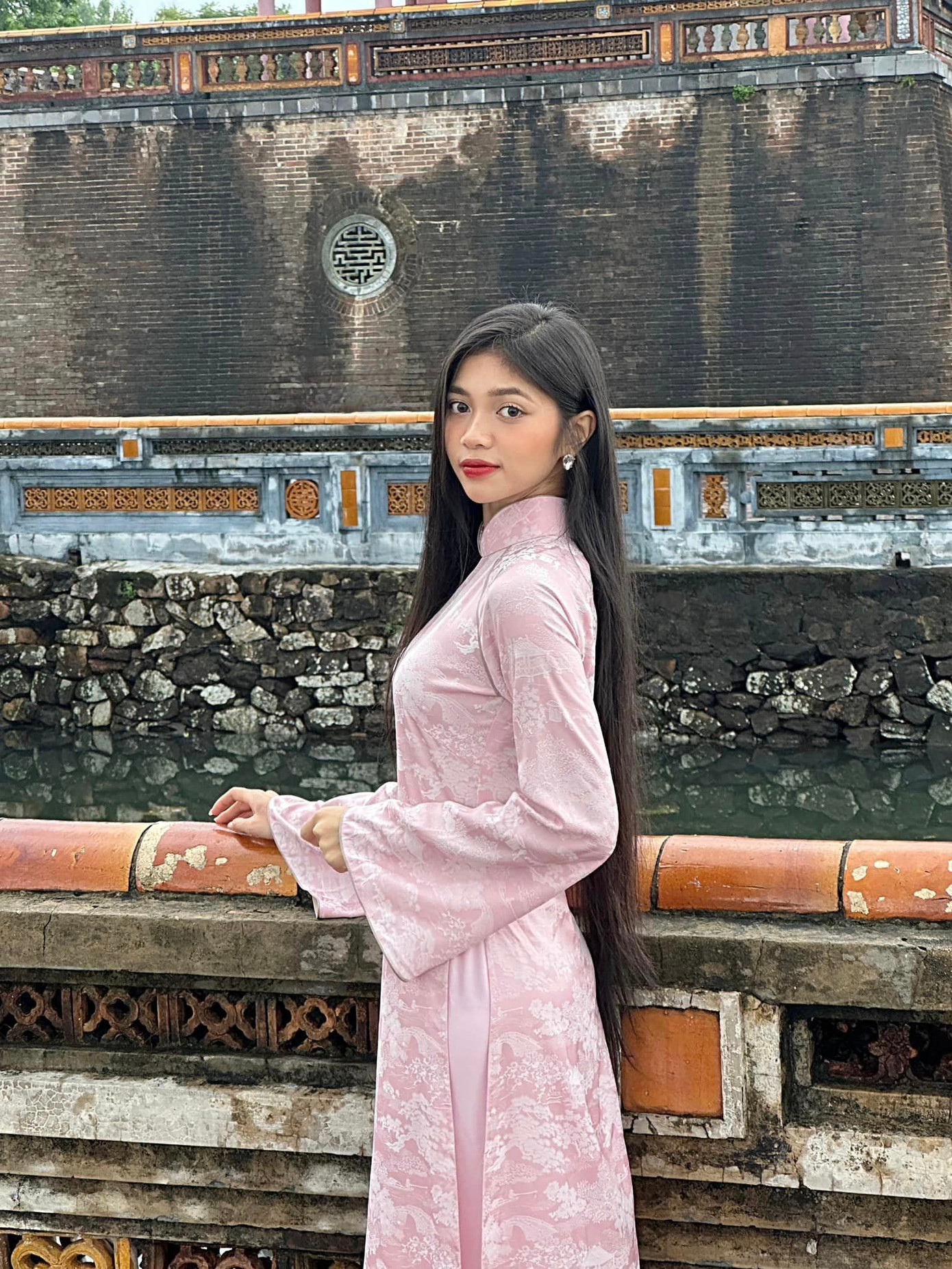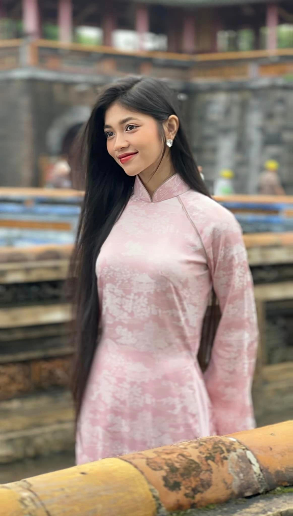 Minh Kiên nhìn vô cùng dịu dàng trong bộ áo dài màu hồng phấn, thả xõa mái tóc dài đen óng ả, trang điểm nhẹ. Chỉ thế cũng đủ để nàng hậu xinh đẹp hút hồn, xứng danh "người đẹp tóc mây" trong số các mỹ nhân Việt hiện nay.