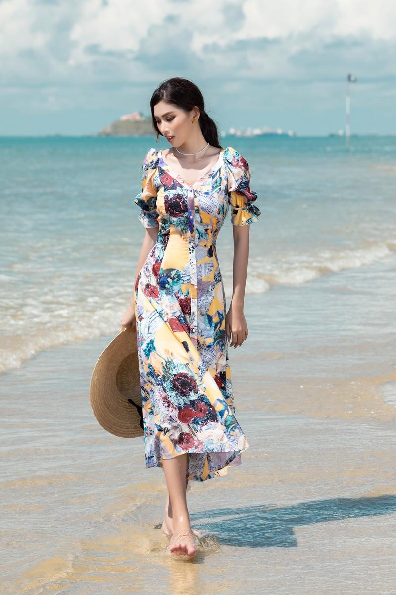 Trong bộ hình thời trang mới, Á hậu Ngọc Thảo khéo léo khoe dáng dưới ánh nắng Hè với những bộ váy dài đi biển. Những thiết kế mang đậm hơi hướng Tropical, kiểu dáng maxi lấy cảm hứng từ những cơn sóng lả lướt, bạn sẽ cảm nhận được sự xuất hiện thấp thoáng của những cơn sóng biển trong bộ váy này.