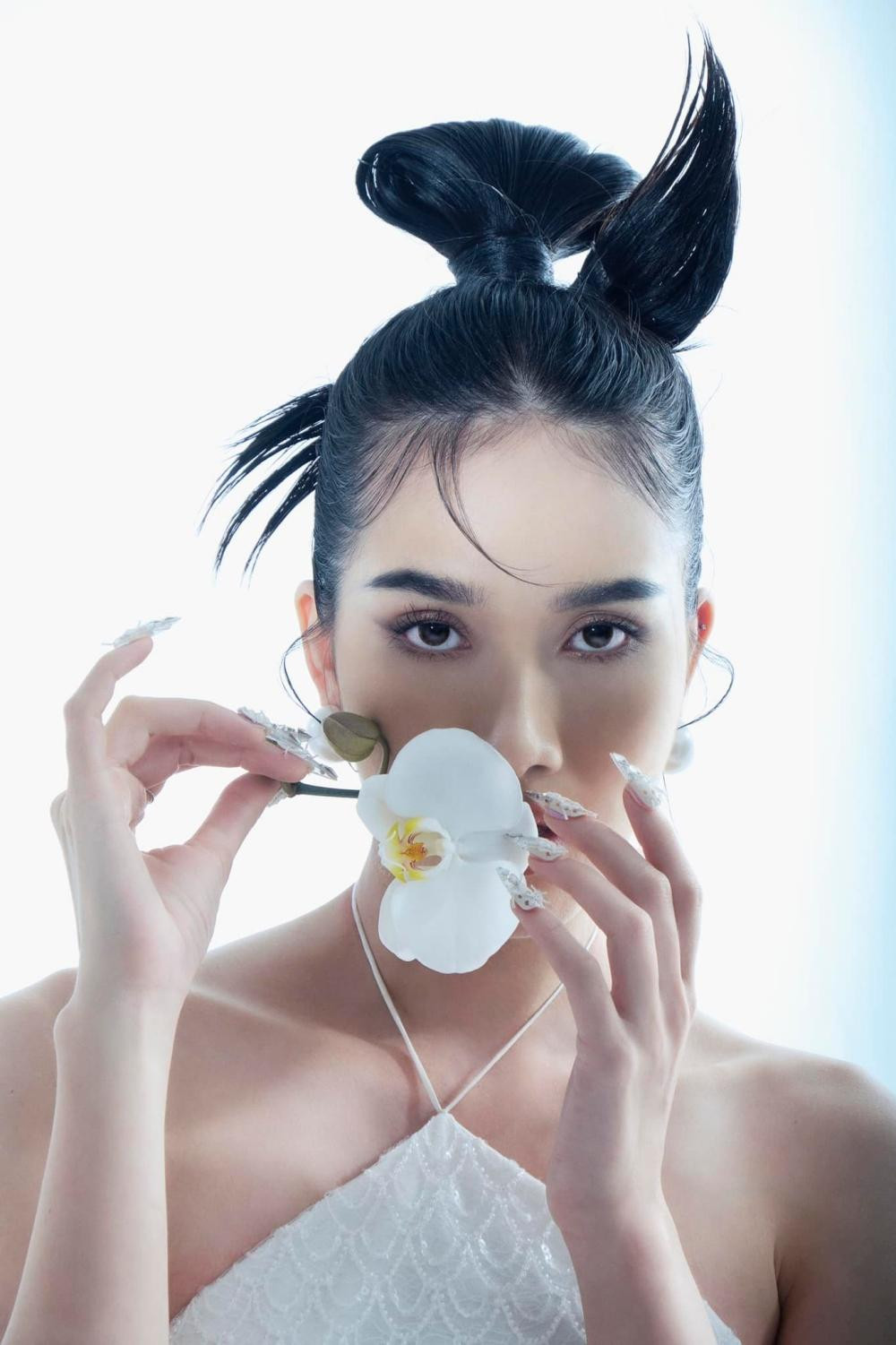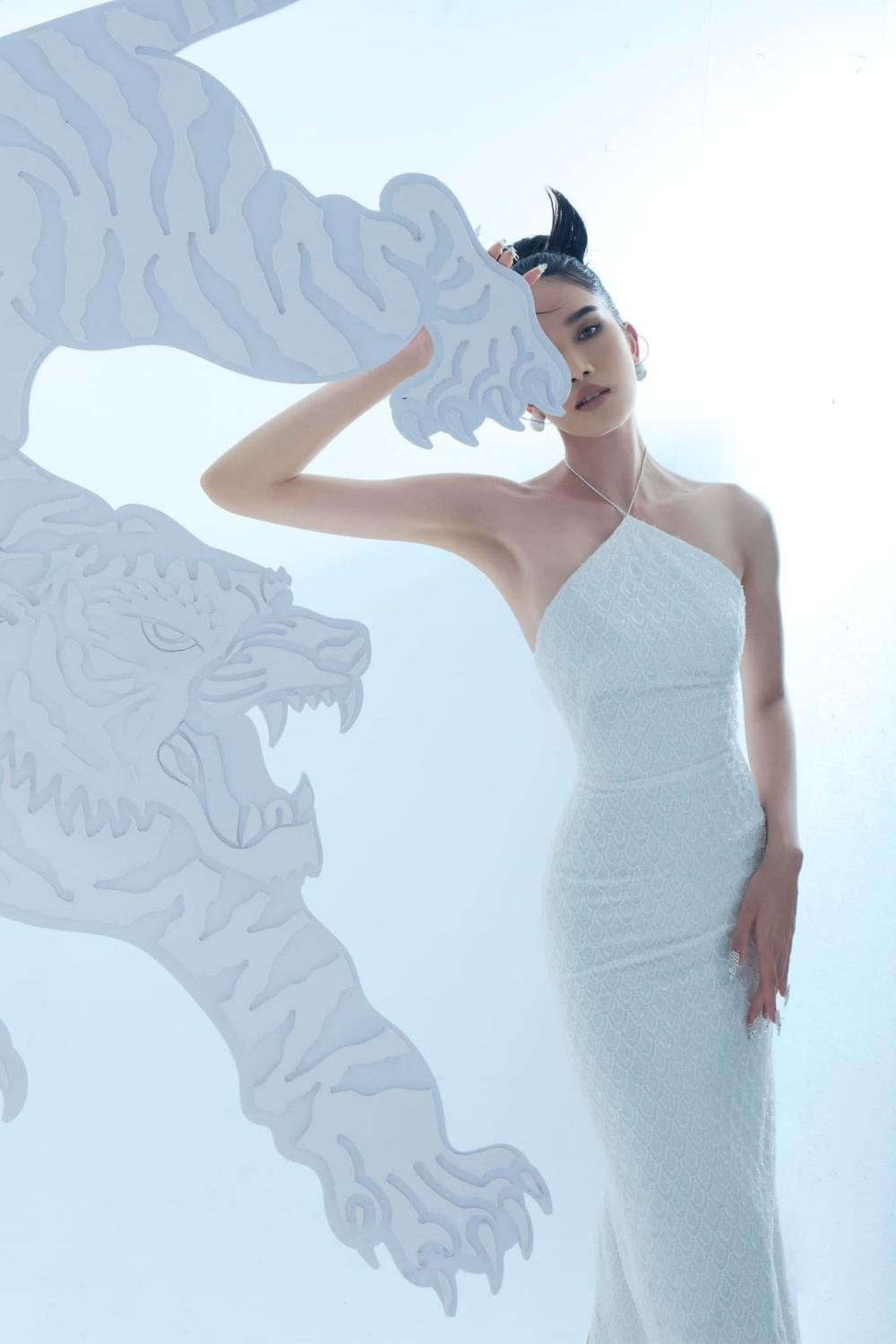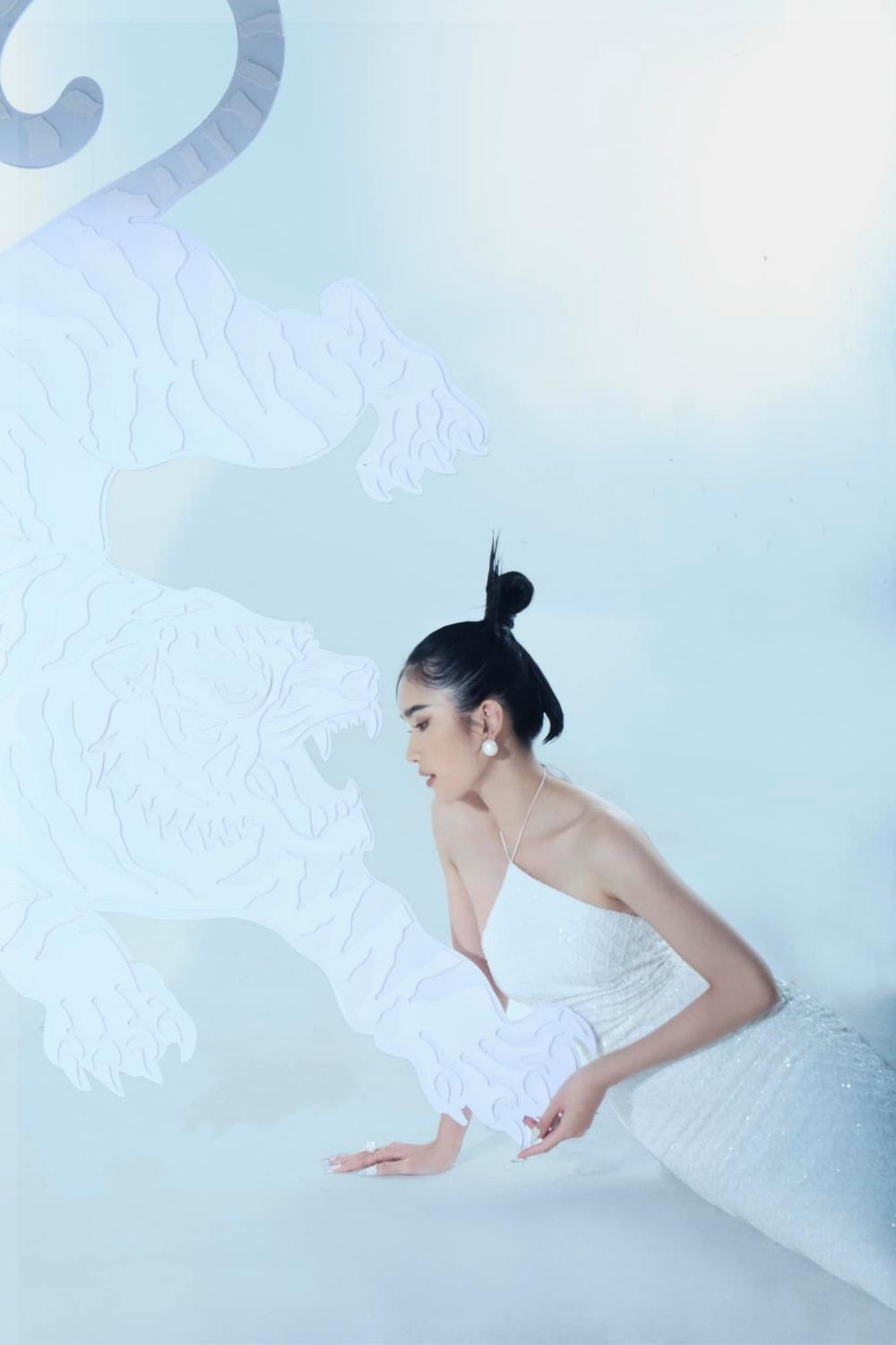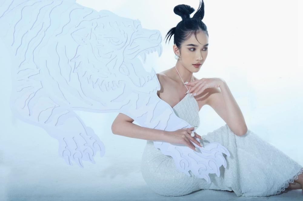 Chào đón năm mới Nhâm Dần 2022, không giống như đa số các người đẹp Việt chọn áo dài và các gam màu Tết đặc trưng là đỏ và vàng, Á hậu Phương Anh chọn trang phục mang hơi hướng dạ hội và gam trắng tinh khiết cho bộ ảnh Tết. Người đẹp chụp cùng hình ảnh chú hổ dũng mãnh, cầm hoa lan trắng, trang điểm và làm tóc đậm chất Á Đông.