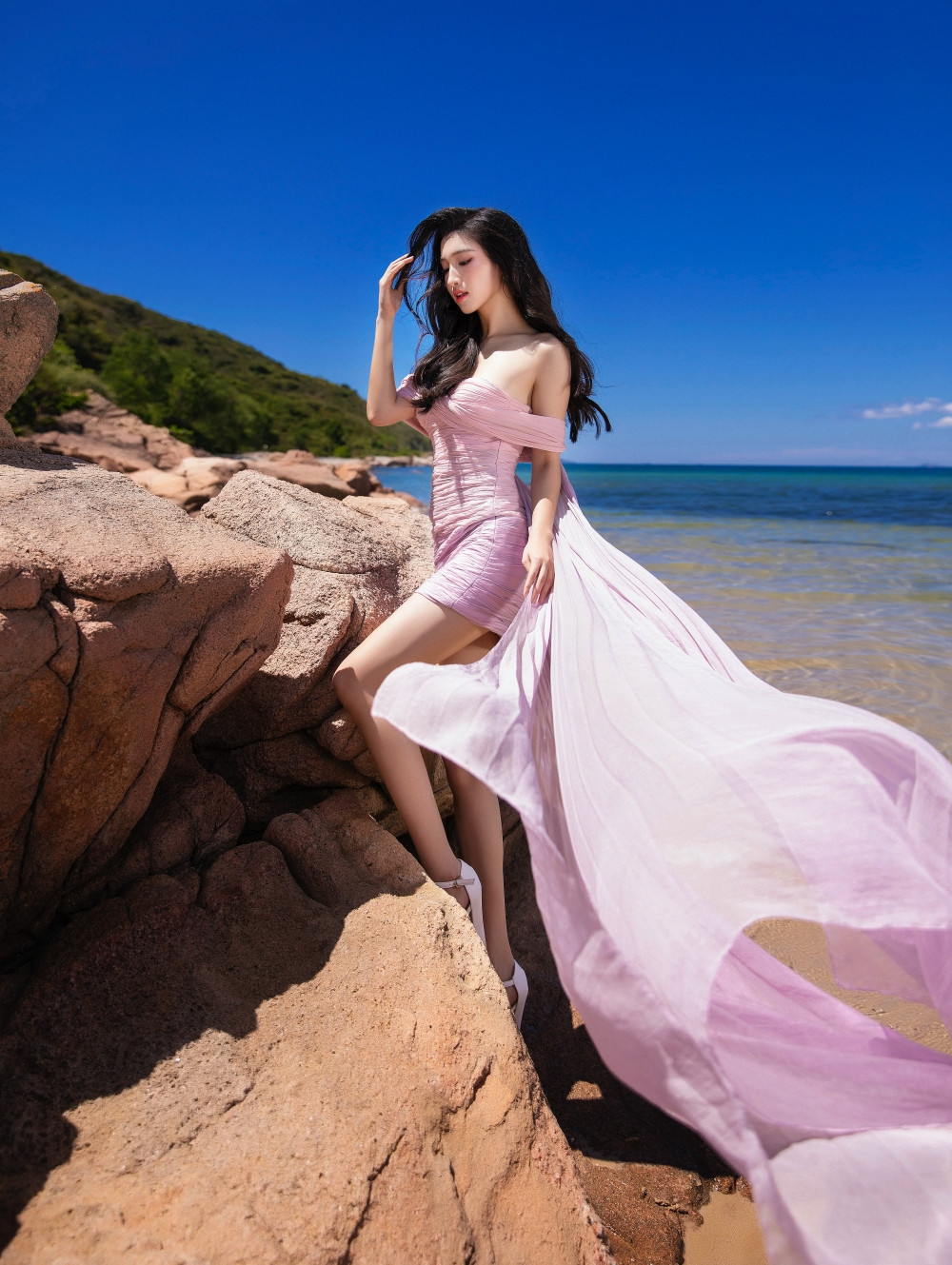Top 3 Miss World Vietnam 2022 thả dáng thơ mộng bên bãi biển với những thiết kế bay bổng. Trong khi Hoa hậu Mai Phương chọn gam màu trắng ngà, Hoa hậu Bảo Ngọc chọn thiết kế màu xanh với váy ngắn khoe chân dài, thì Á hậu Phương Nhi chọn thiết kế màu tím nhạt, với phần tay buông hờ, khoe trọn xương quai xanh và bờ vai thon gọn.