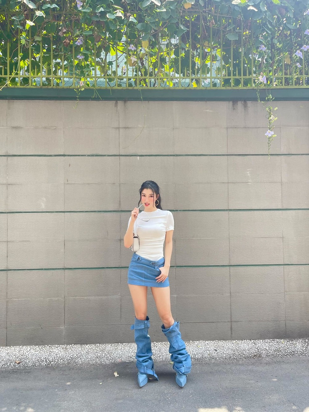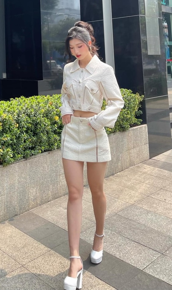 Nàng hậu rất chuộng kết hợp chân váy siêu ngắn với áo thun hoặc sơ mi, tạo thành set đồ đầy trẻ trung, hiện đại hợp với lứa tuổi mà vẫn tôn dáng. Trong thời gian thi Hoa hậu Thế giới Việt Nam 2022, Phương Nhi từng gây ấn tượng với vòng eo 57cm nhưng hóa ra đôi chân nàng hậu cũng đáng chú ý không kém.