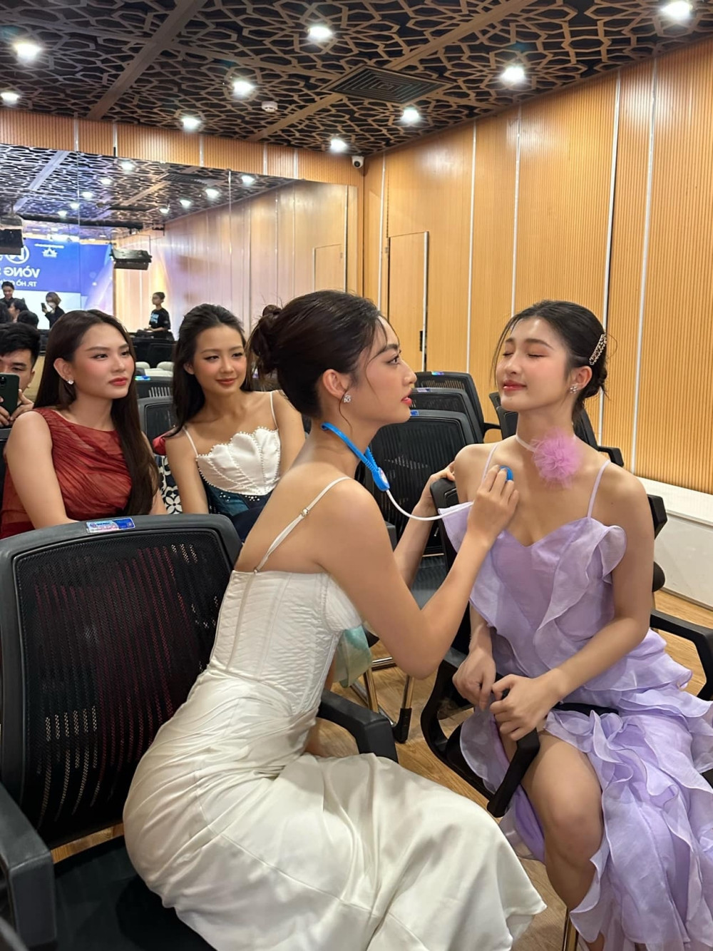 Thời gian gần đây, Hoa hậu Lương Thùy Linh được các nàng hậu nhắc đến liên tục với một vai trò mới: Nhiếp ảnh gia. Nàng hậu chụp ảnh các chị em Hoa - Á hậu của mình ở mọi lúc mọi nơi. Thế nhưng trong lần gặp nhau này, Hoa hậu Lương Thùy Linh bất ngờ "đổi nghề", nàng hậu dùng một bộ khám bệnh đồ chơi để “khám bệnh” cho Á hậu Phương Nhi.
