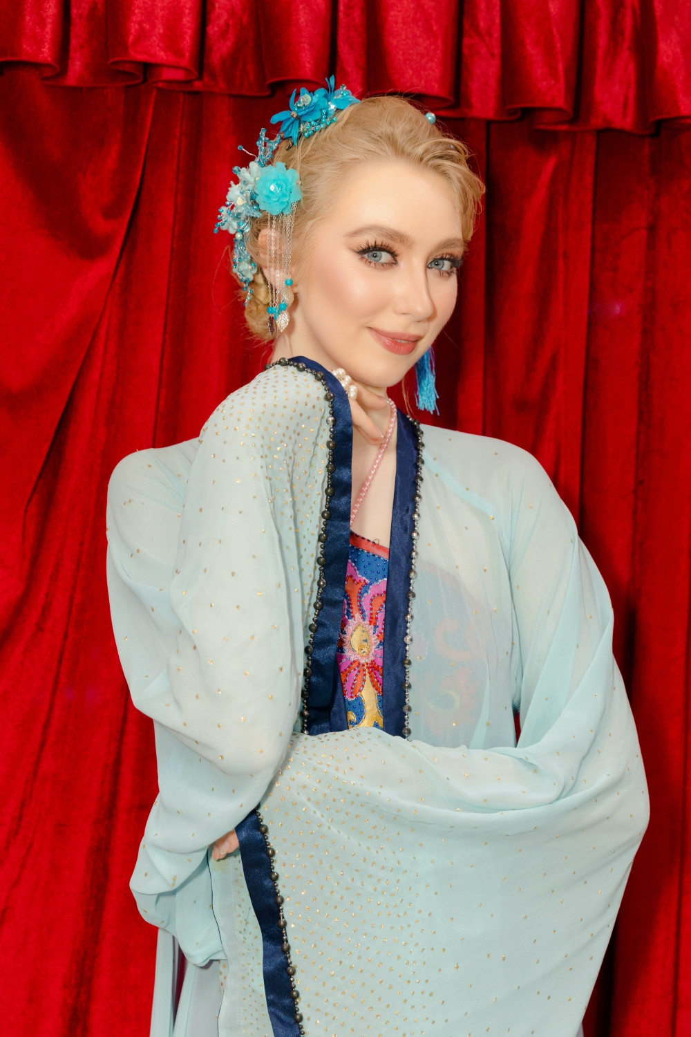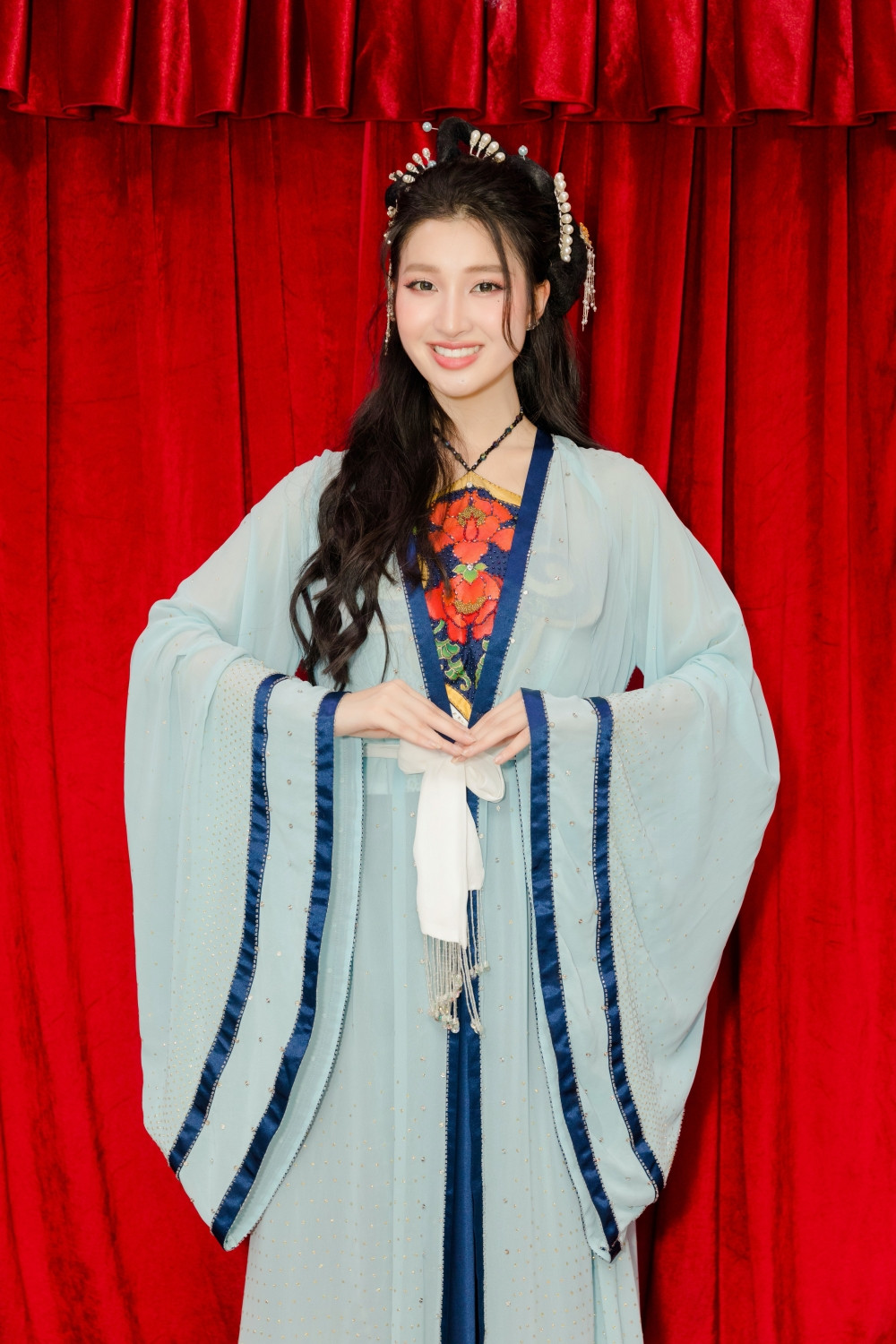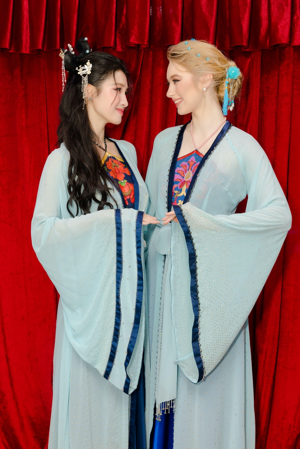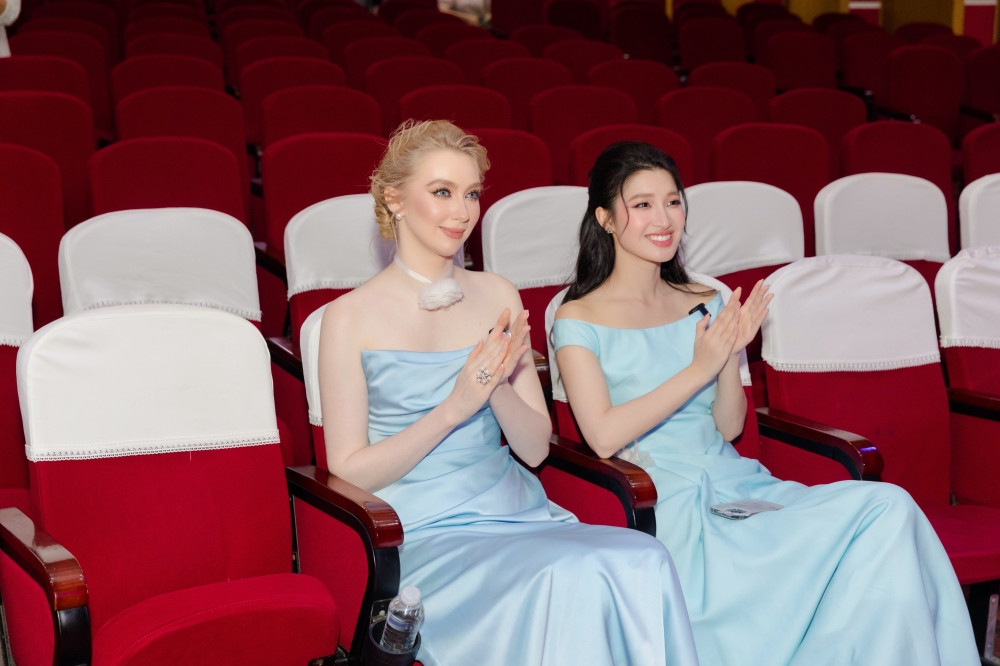 Hai nàng hậu đã chọn 2 bộ trang phục tương đồng với sắc xanh nhẹ nhàng, đính kết tinh tế. Jasmin nói rằng cô chọn bộ trang phục của mình là để giống với Phương Nhi, vì cô nghe nói rằng Thúy Kiều và Thúy Vân là hai chị em.