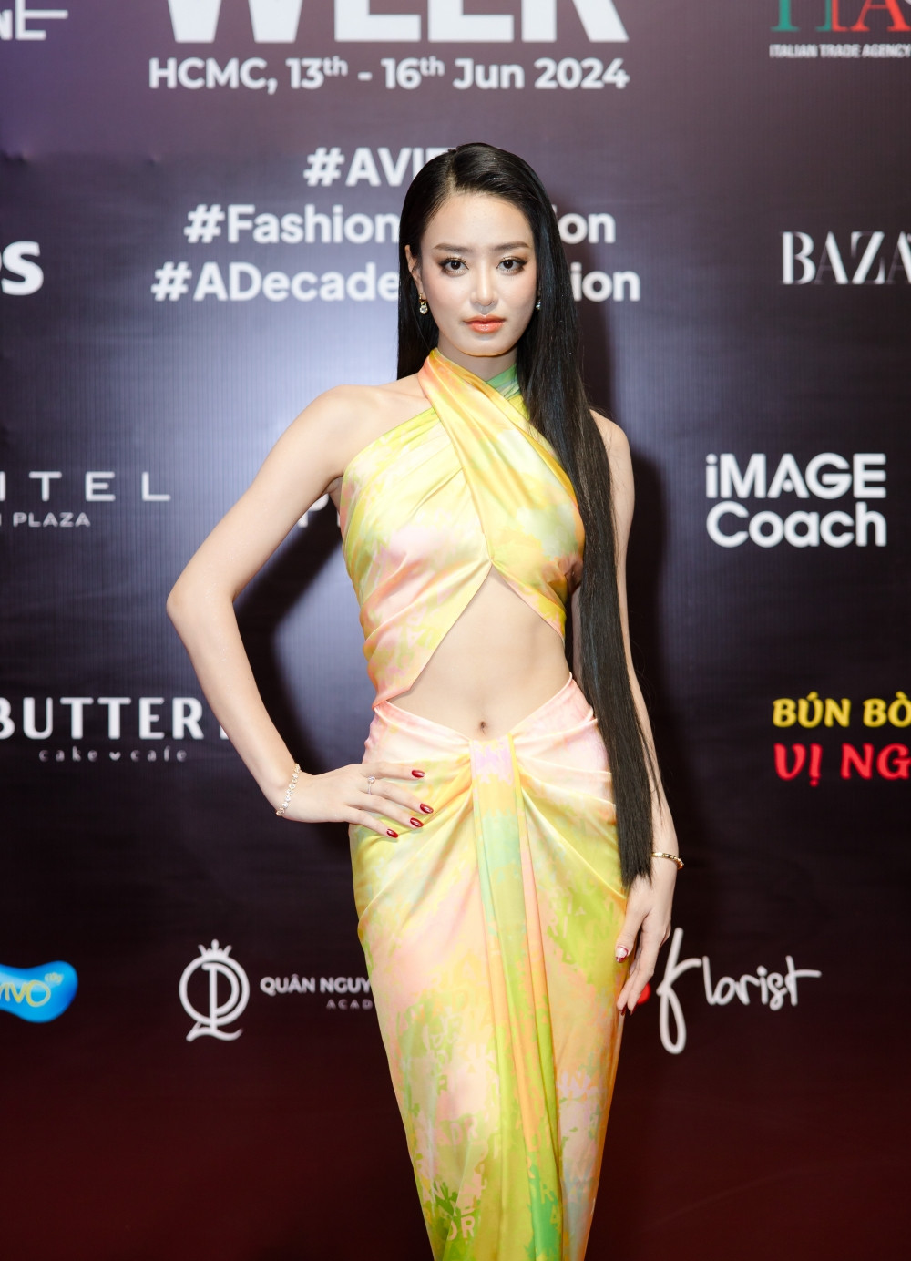 Á hậu 1 Miss Grand Vietnam 2023 Bùi Khánh Linh nổi bật trong sắc màu của bộ cánh khoét eo tinh tế.
