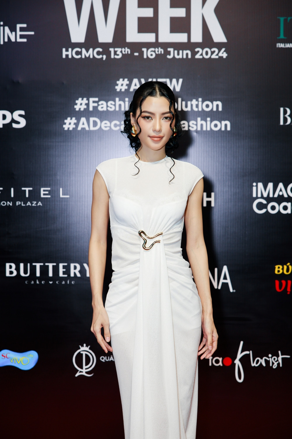 Á hậu Thảo Nhi Lê chiếm trọn spotlight thảm đỏ đêm khai mạc với thiết kế trễ vai màu trắng, điểm nhấn là chiếc nón cỡ đại làm từ chất liệu ren tone sur tone với bộ trang phục.