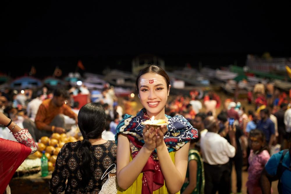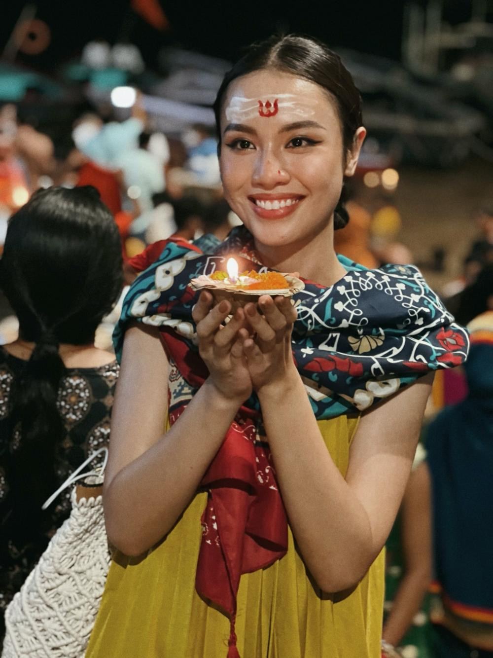 Người đẹp chia sẻ đây là lần đầu tiên cô đến Ấn Độ và cũng là lần đầu cô có cơ hội được trải nghiệm nghi lễ cầu an tại dòng sông Hằng - dòng sông linh thiêng của người Ấn.