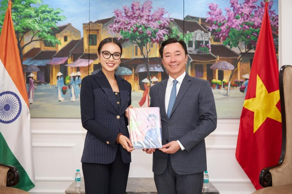 Nàng Á hậu cũng vinh dự có cơ hội gặp gỡ và trò chuyện với người đứng đầu Đại sứ quán Việt Nam tại Ấn Độ - Đại sứ Phạm Sanh Châu.