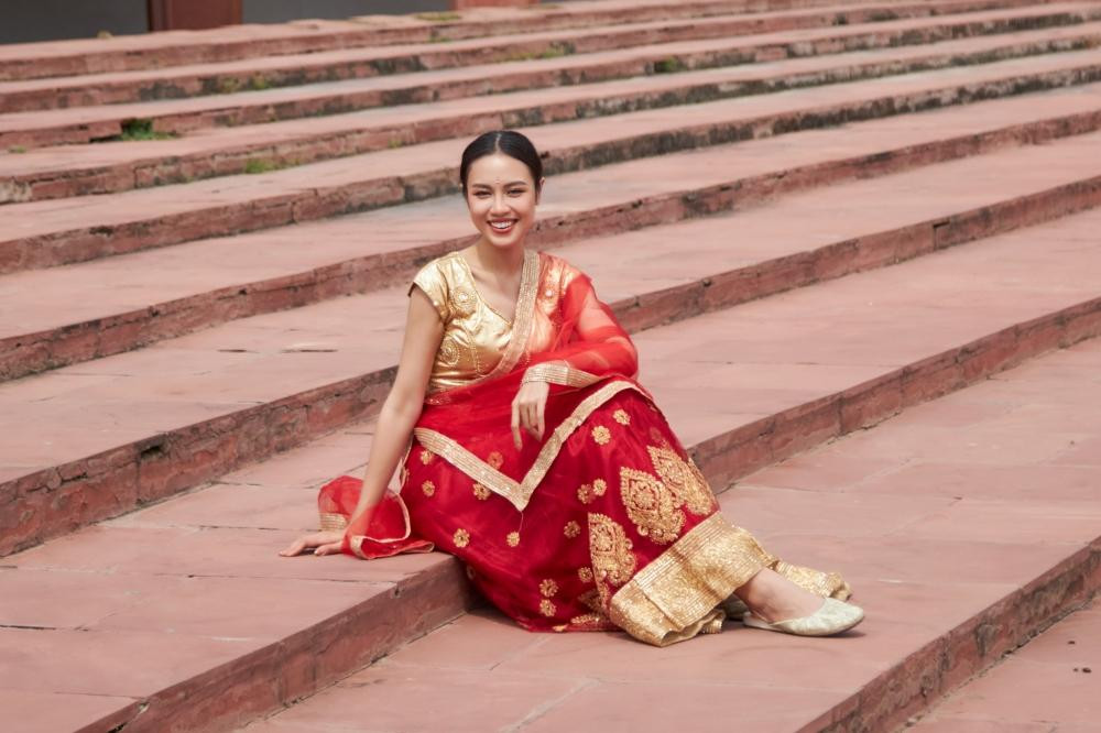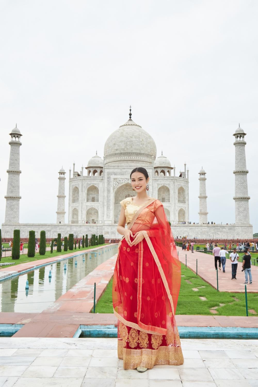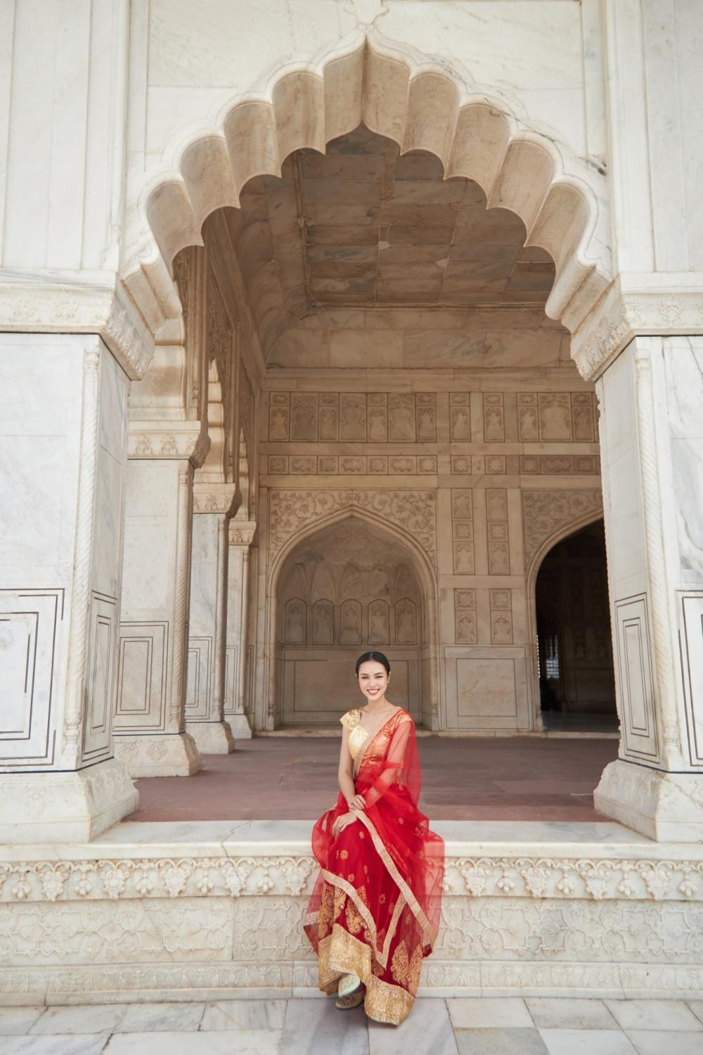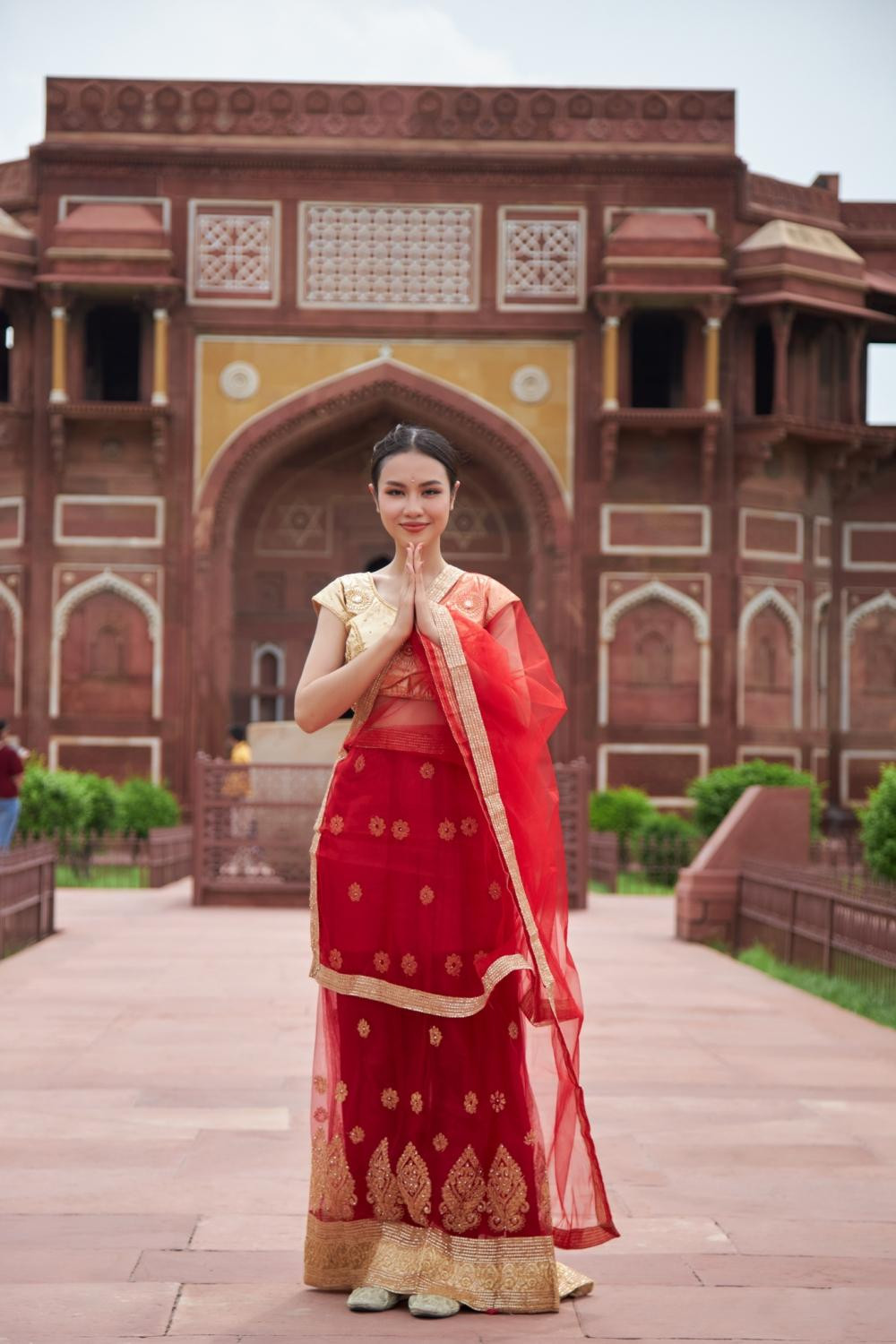 Với tone màu đỏ và vàng đồng của bộ trang phục, Á hậu Thủy Tiên nổi bật giữa không gian kiến trúc của Taj Mahal và Red Fort. Thủy Tiên cho biết vì Taj Mahal và Red Fort đều là hai địa điểm có bề dày văn hóa và lịch sử lâu đời của Ấn Độ nên cô chọn diện trang phục truyền thống để hòa mình và cảm nhận sâu sắc hơn về vùng đất này.