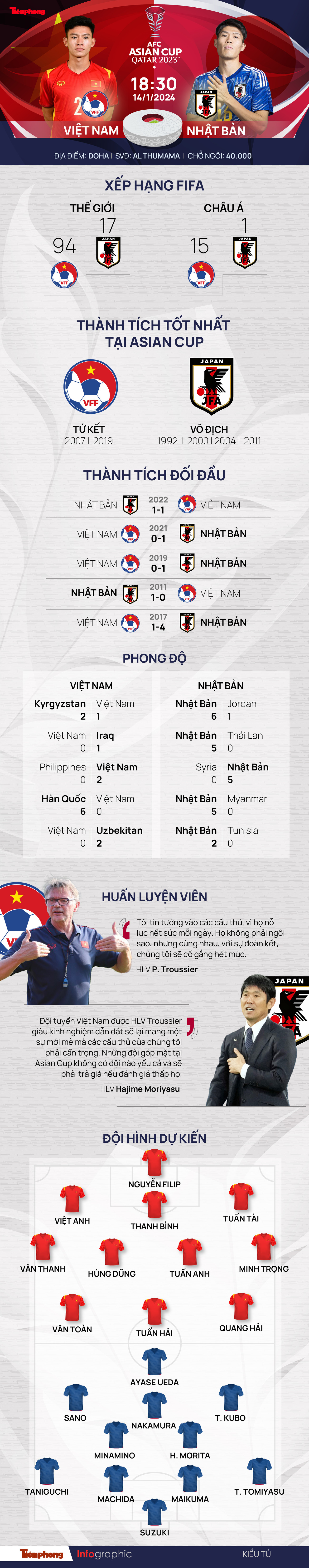 TPO - Tuyển Việt Nam sẽ chính thức bước vào trận đấu ra quân tại AFC Asian Cup 2023 lúc 18 giờ 30 ngày 14/1. Đối thủ của chúng ta, tuyển Nhật Bản được đánh giá là ứng viên cho chức vô địch, liệu thầy trò HLV Philippe Troussier có làm nên kỳ tích?
