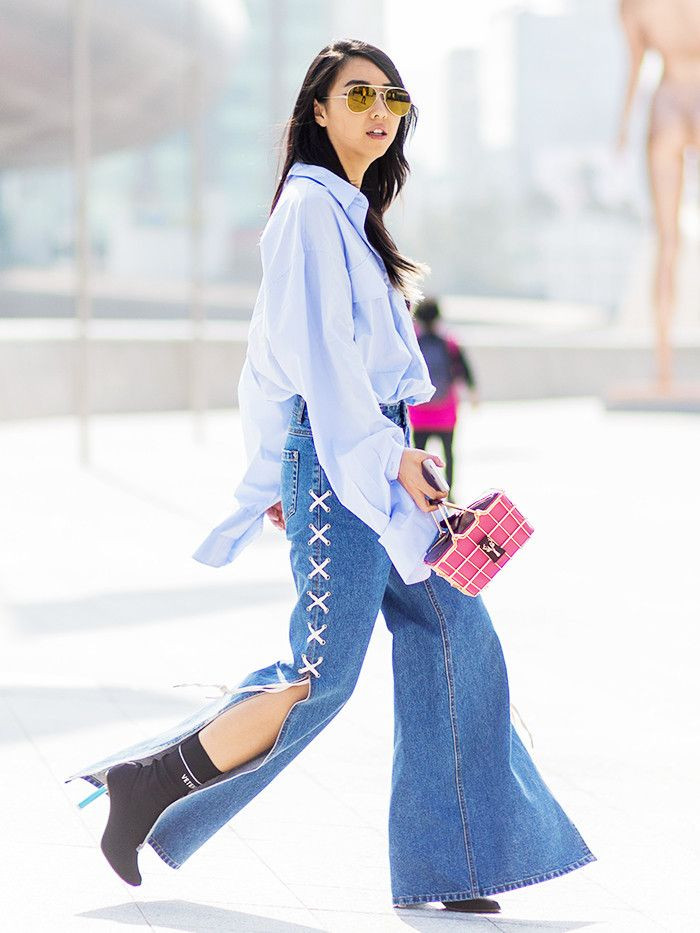 Double denim đang quay trở lại, vì vậy bạn có thể dễ dàng kết hợp áo sơ mi hoặc áo khoác denim với quần jeans. Nhưng đừng mặc trên dưới cùng màu nhé, ngược lại các sắc thái xanh denim khác nhau sẽ tạo ra sự tương phản và làm dịu bộ trang phục của bạn.