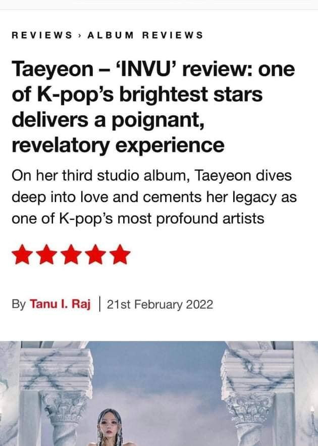 New Musical Express (NME) là chuyên trang đánh giá về âm nhạc, phim ảnh và văn hóa. Đây là trang chuyên phê bình âm nhạc lâu đời và nổi tiếng của Anh. Trong bài đánh giá mới đây của Tanu I. Raj, nhà phê bình này không ngần ngại tán dương và chấm điểm tuyệt đối 5/5 cho full album thứ ba của Taeyeon - INVU.