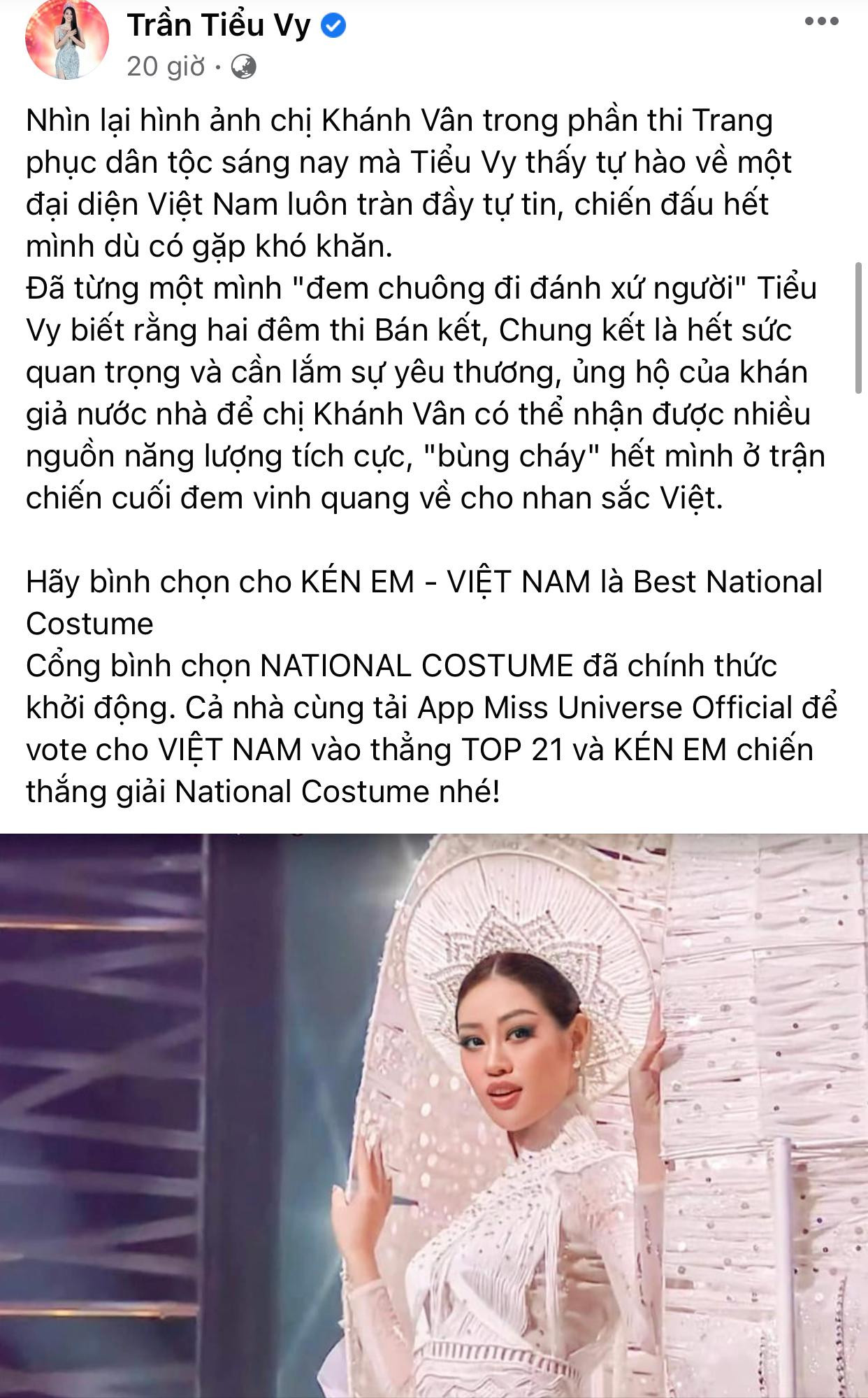 Về phía "hậu phương", loạt sao V-Biz từ diễn viên, ca sĩ đến những người đẹp đều bày tỏ sự phấn khích lẫn tình cảm yêu quý dành cho Hoa hậu hoàn vũ Việt Nam 2019. Không chỉ khen ngợi hết lời màn trình diễn "xuất thần" của Khánh Vân tại đấu trường quốc tế, Hoa hậu H'Hen Nie, Hoa hậu Tiểu Vy, diễn viên Quang Trung... còn ra sức kêu gọi bình chọn cho Kén Em cũng như đại diện đến từ Việt Nam.