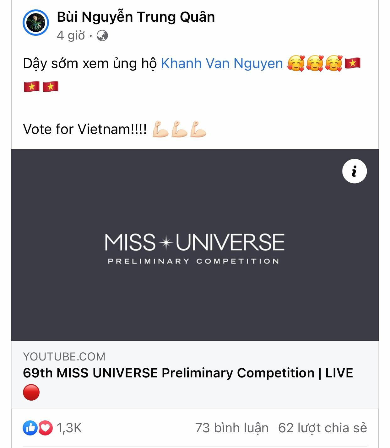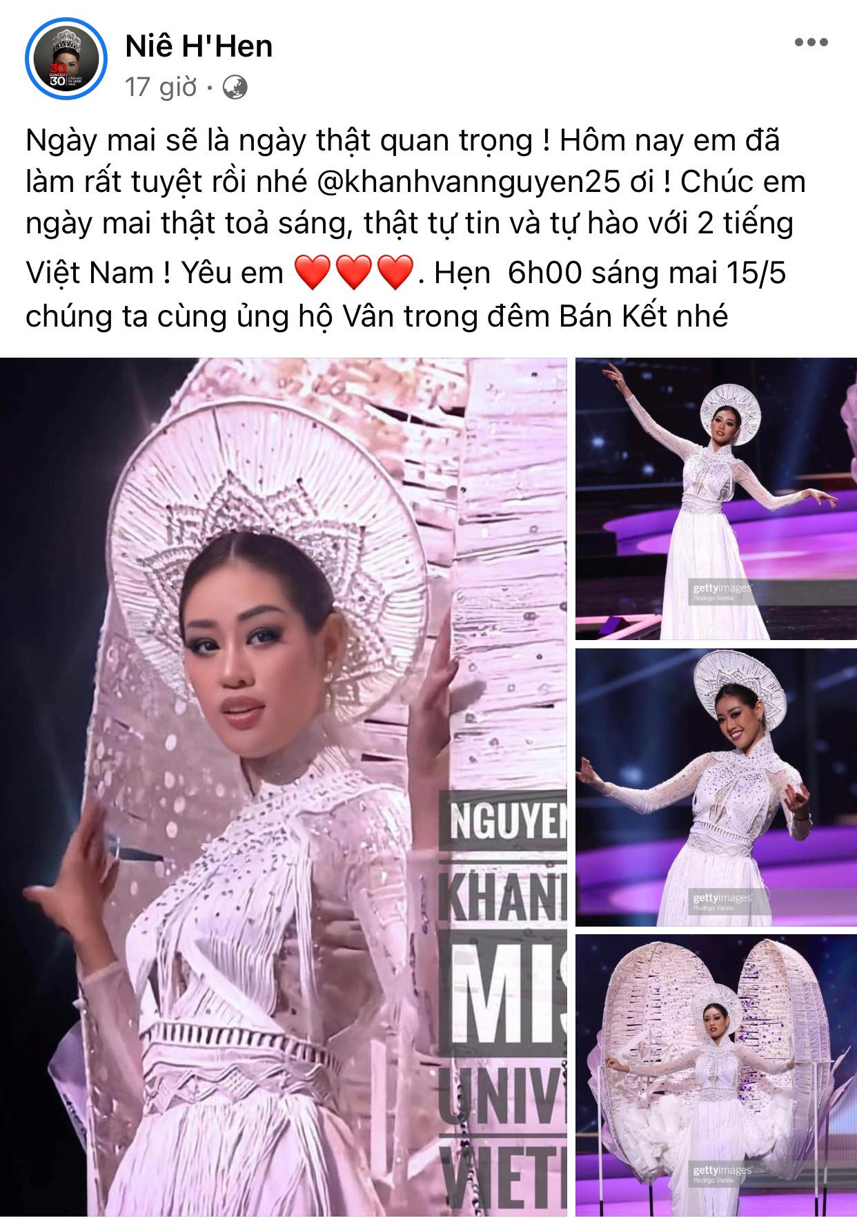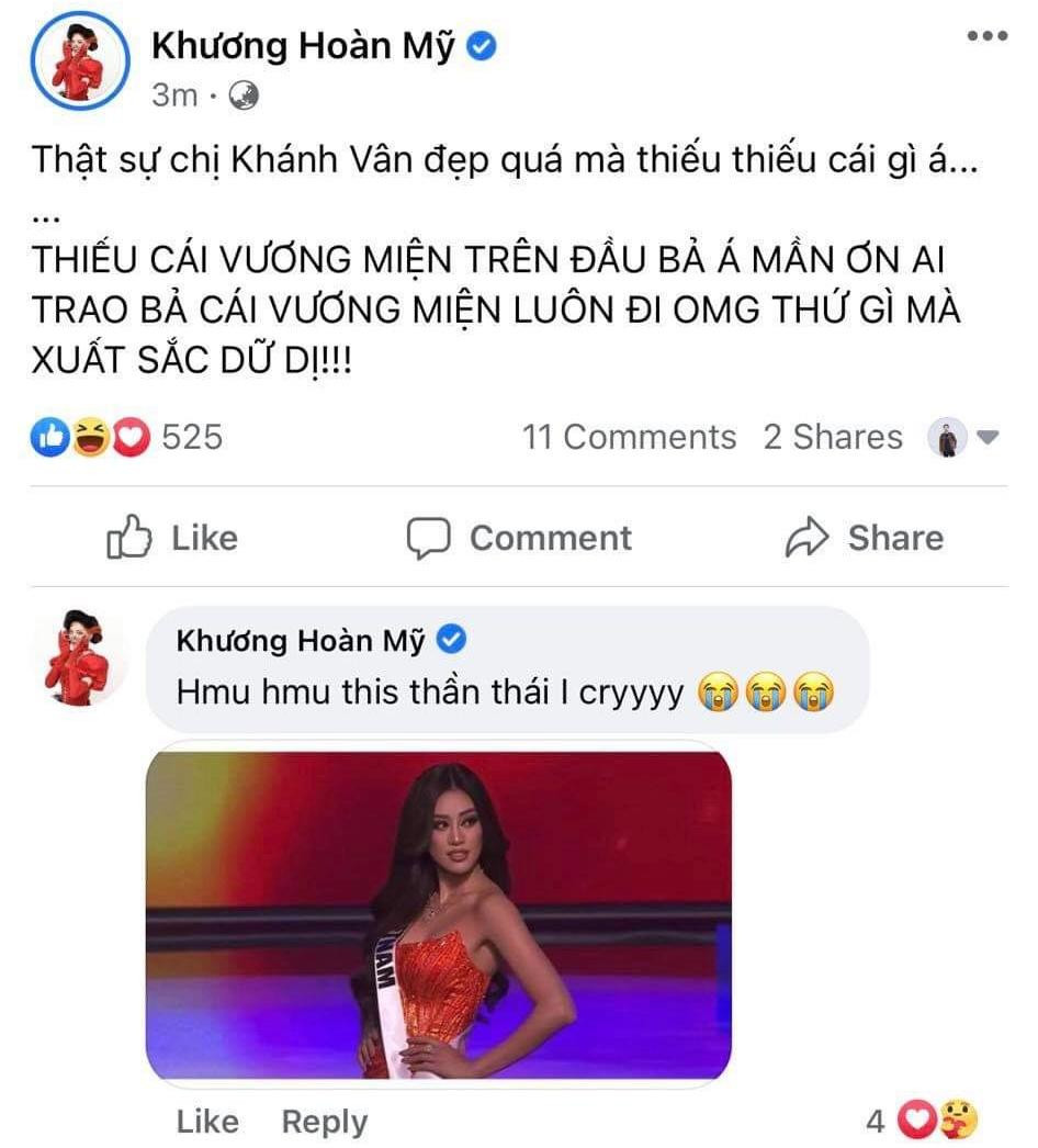 Trước phần thi của Khánh Vân trên đấu trường quốc tế, cô nàng Orange không giấu giếm sự phấn khích, thậm chí còn "đòi" ai đó hãy trao thẳng vương miện cho đại diện Việt Nam. Cùng cảm xúc, Nam Thư chia sẻ hình ảnh của Khánh Vân lên trang cá nhân với lời khen ngợi "một trời thần thái". Bên cạnh đó, Trung Quân Idol, BB Trần, Dương Triệu Vũ... không quên kêu gọi người hâm mộ tích cực bình chọn, giúp đại diện Việt Nam có thể "thẳng tiến" đến Top 21 Miss Universe.