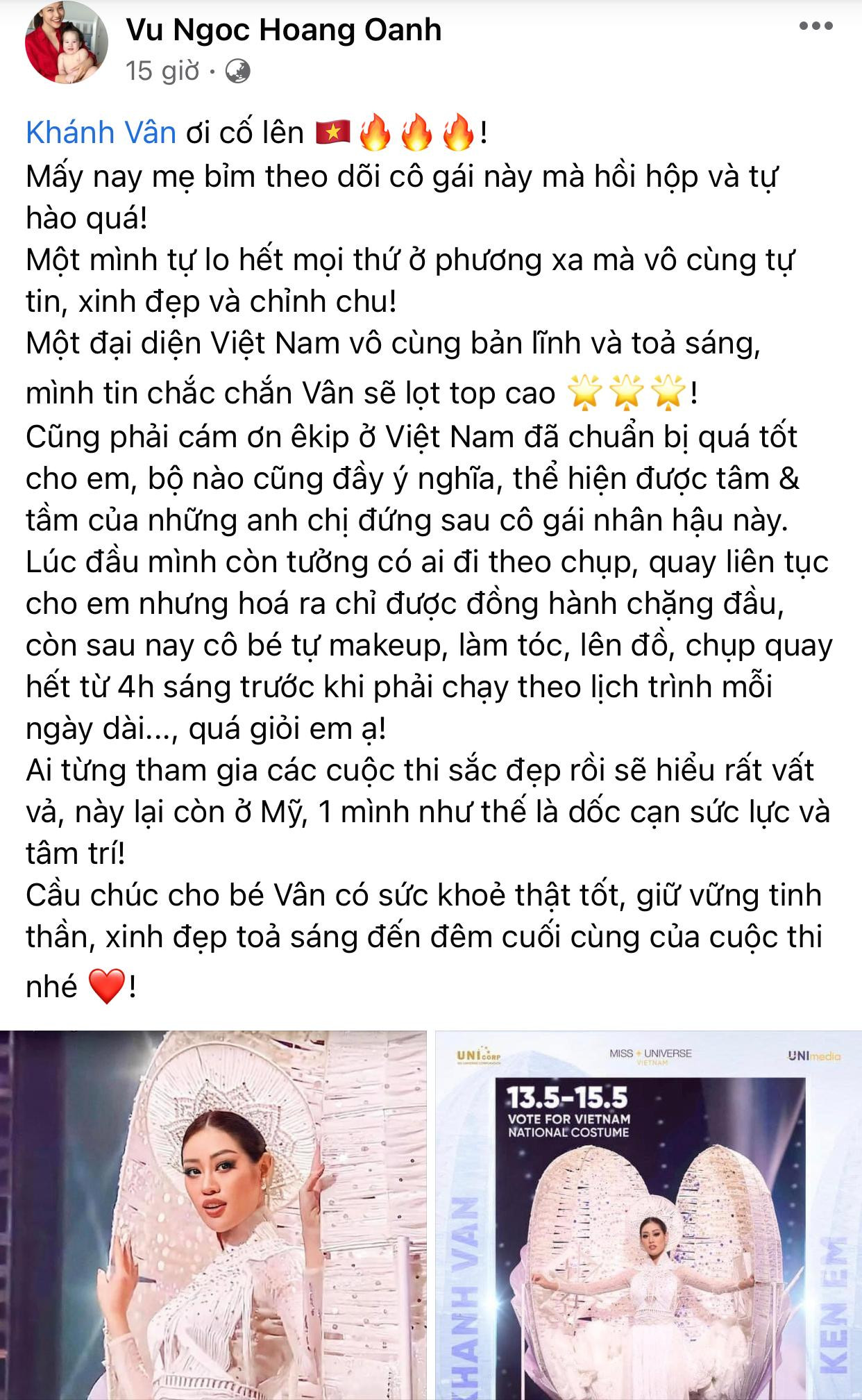 Bên cạnh đó, Á hậu Hoàng Oanh, diễn viên Diệu Nhi cũng gửi đến Khánh Vân nhiều lời động viên khi cô nàng một thân một mình "cân" hết mọi thứ từ tóc tai, make-up đến trang phục tại đất Mỹ.
