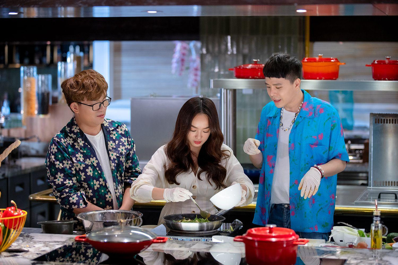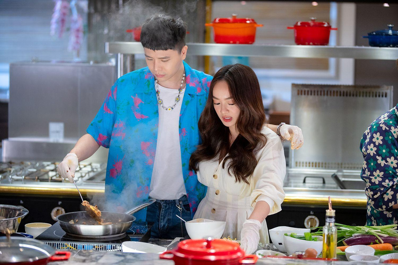 Sau đó, mỗi đội có 30 phút vào bếp để hoàn thành món bánh xèo Hàn Quốc. Dù không có nhiều kinh nghiệm nấu đồ ăn châu Á nhưng Kaity Nguyễn lại điềm tĩnh và trở thành người “gánh team” cho Trịnh Thăng Bình. Cô nàng làm lần lượt các thao tác theo trí nhớ, trong khi Trịnh Thăng Bình tư vấn về gia vị và nhắc nhở các nguyên liệu cần có để món bánh hài hòa hương vị.
