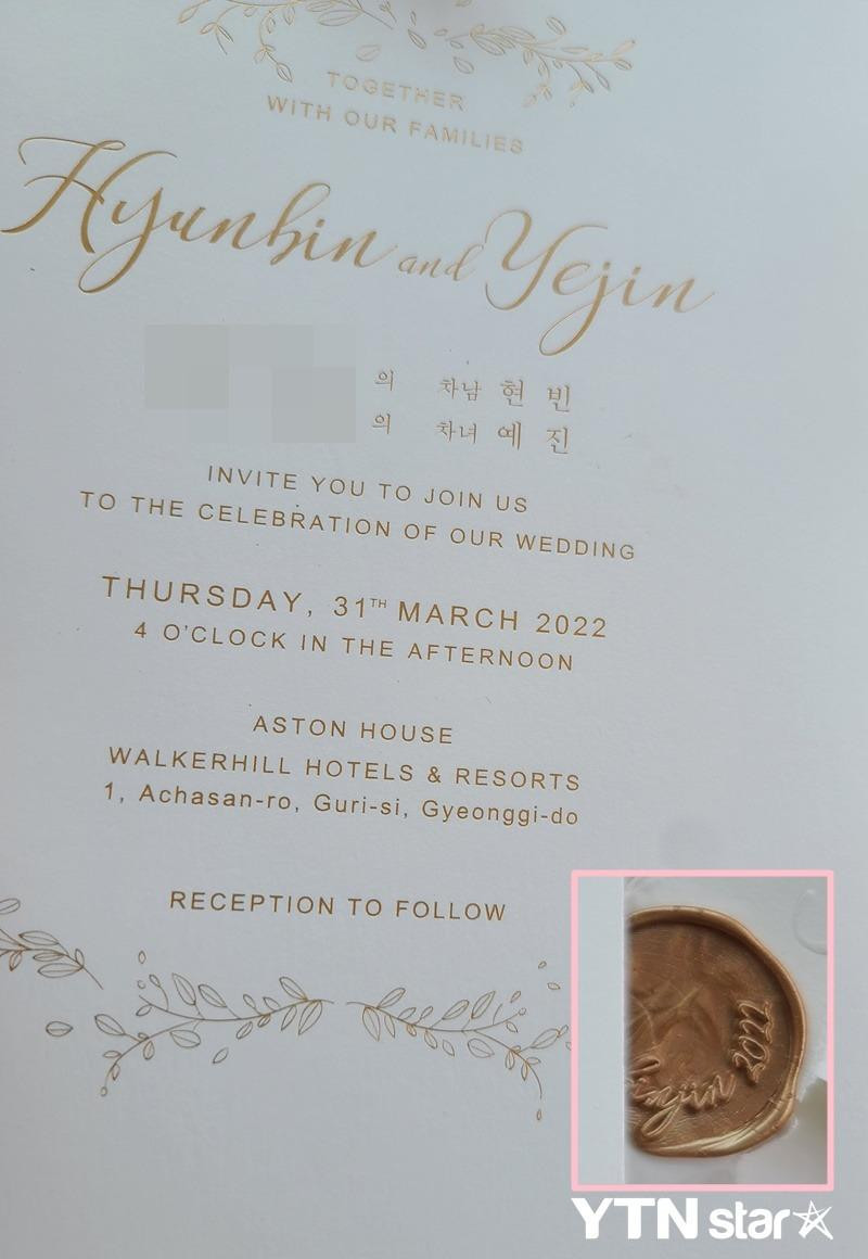 Ngay sau đó, YTN Star độc quyền công bố thiệp cưới của Hyun Bin - Son Ye Jin. Thiệp cưới mô tả thiết kế cô dâu mặc váy cưới với tấm voan được trang trí 3D. Phía góc phải tấm thiệp có cụm từ “BinJin” (bắt nguồn từ Bin của Hyun Bin và Jin của Son Ye Jin), được khắc bằng vàng thêu, tạo sự thanh lịch, sang trọng.