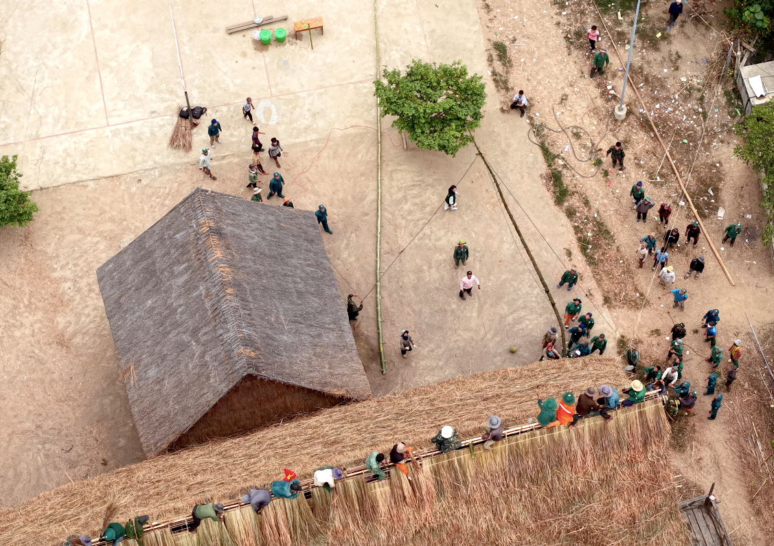 TPO - Cảnh cả trăm người dân Ba Na cùng nhau lợp mái, làm nhà rông của làng Kon Sơ Lăl (xã Hà Tây, huyện Chư Păh, Gia Lai) sừng sững, uy nghi khiến ai thấy cũng trầm trồ.