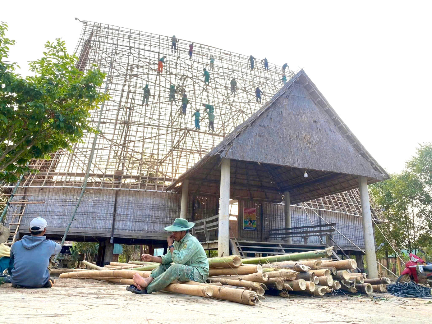 Vật liệu làm nhà rông được mọi người chuẩn bị trước đó nhiều ngày.